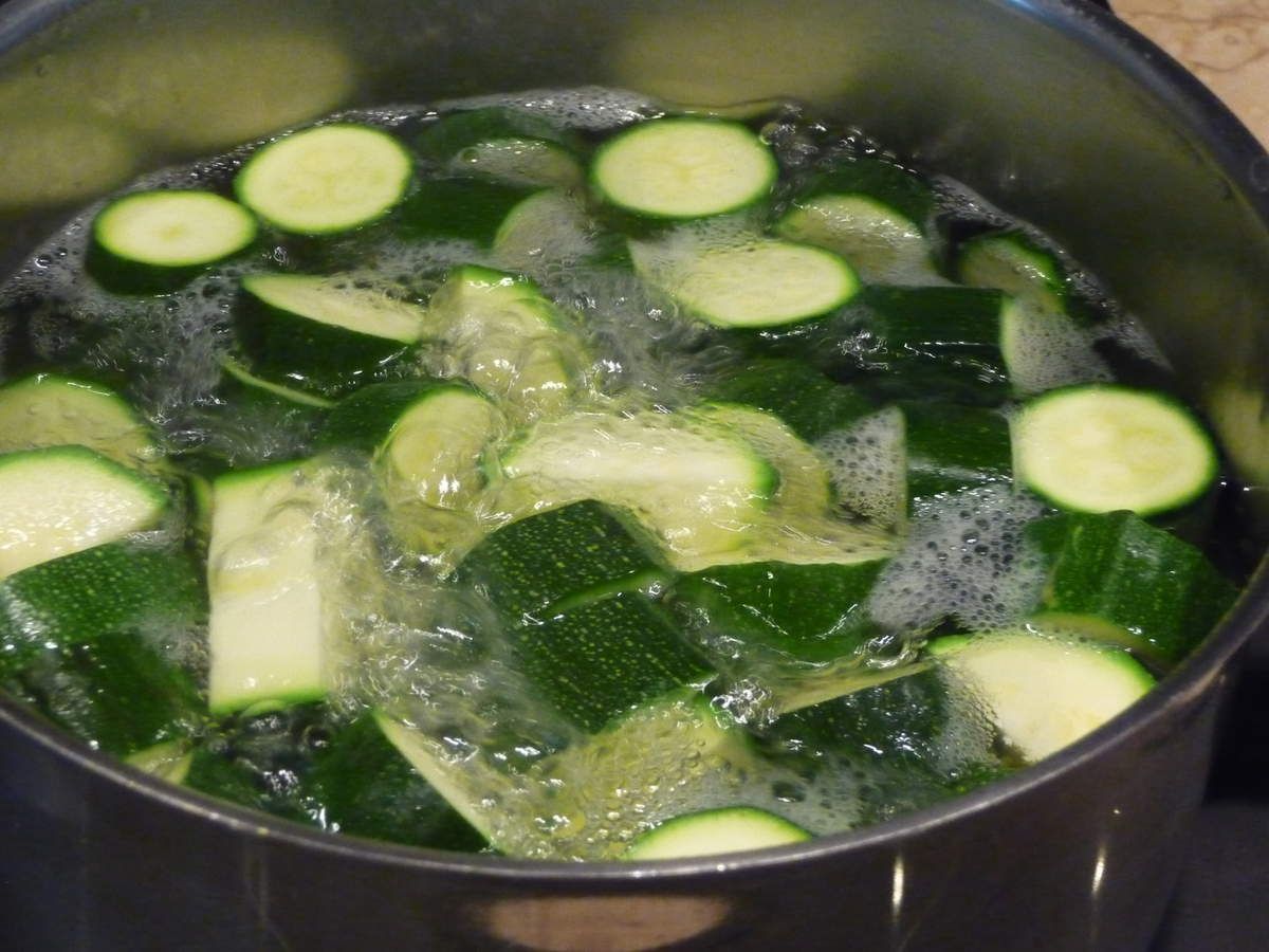 1) Passer les courgettes sous l'eau froide. Les couper en deux puis en tronçons. Dans une casserole, verser 8dl d'eau. Lorsque l'eau est à ébullition, ajouter les courgettes et 2 càc de sel. Couvrir et cuire à feu moyen 20 minutes.