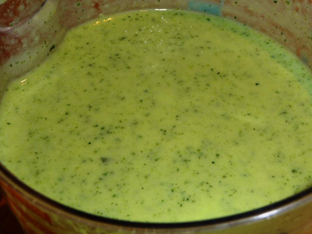 3) Revenons à nos courgettes. Après 20 minutes de cuisson, les mettre dans un récipient haut AVEC le jus de cuisson ou les laisser dans la casserole. Ajouter 200g de ricotta, 7 feuilles de menthe, poivrer. Mixer le tout finement avec un plongeur ou mettre le mélange dans un blender. Goûter et rectifier l'assaisonnement. Réfrigérer au moins 4 heures pour que le velouté soit bien froid.