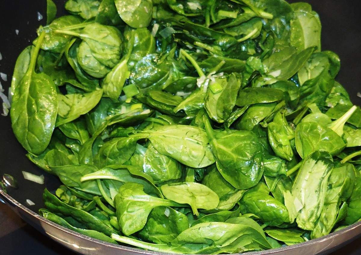 5) Hacher l'oignon et les gousses d'ail. Faire chauffer 20g de beurre dans une grande poêle et ajouter les oignons et ail. Faire revenir une minute sur feu moyen. Ajouter les épinards. S'ils sont frais, ne vous en faites pas, ils vont réduire de 3/4. Saler et poivrer et mélanger. Cuire ainsi 10 à 15 minutes jusqu'à ce qu'ils aient rendu toute leur eau. Mettre dans une passoire et appuyer avec une spatule fermement pour ôter l'éventuel jus restant. Réserver.