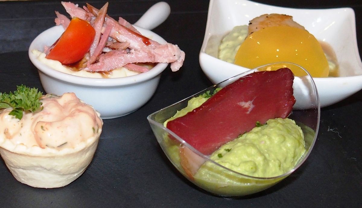 Je vous propose aujourd'hui de délicieux petits amuse-bouches pour vos fêtes de fin d'année. Pour vous donner des idées. Des tartelettes de cocktail de crevettes, des noix de St-Jacques sur une purée d'avocat et sa gelée d'agrumes, des magrets de canard fumés sur purée de petits pois et une purée de panais et jambon. Simples à préparer, ils feront tout leur petit effet. Et puis c'est mieux que des chips ou des cacahuètes non?