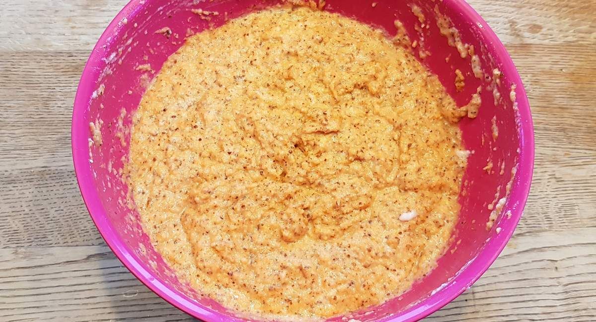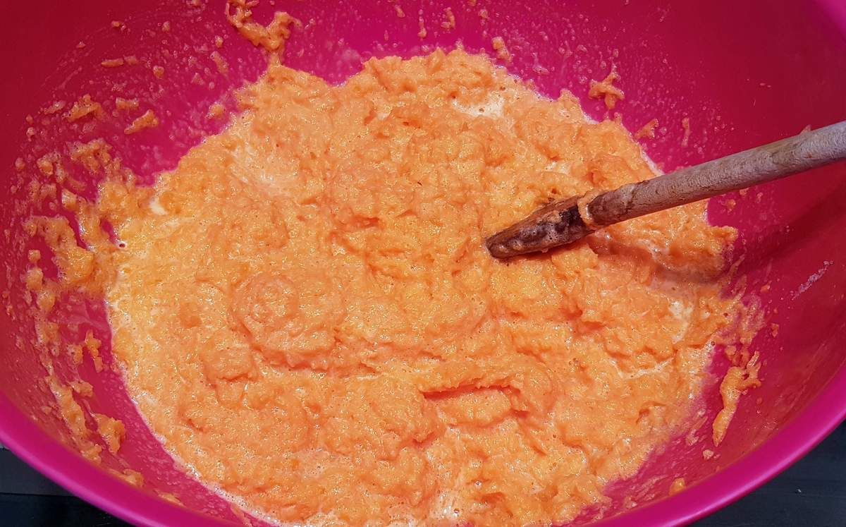 2) Peler et râper les carottes finement jusqu'à obtenir 300g (à l'aide d'un robot ménager par exemple). Ajouter les carottes dans le mélange jaunes d'oeufs et sucre. Mélanger avec une spatule. Ajouter la poudre d'amandes. Mélanger. Râper le zeste du demi-citron et presser le jus. Ajouter et mélanger.