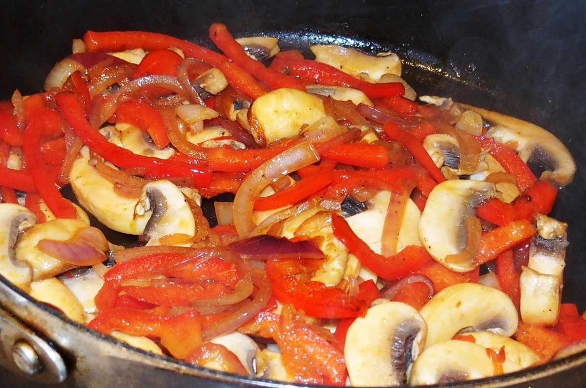 4) Dans la même poêle, remettre un filet d'huile à rôtir à chauffer sur feu moyen-fort. Ajouter le contenu du bol poivron-oignon rouge. Poivrer et laisser cuire en mélangeant durant 4 minutes. Ajouter les champignons de Paris et cuire encore 2 minutes. Saler un peu. Sur feu moyen, ajouter la farine, le concentré de tomate, le sucre, les paprikas. Bien mélanger. Diluer la moutarde dans le vin blanc avec une fourchette et ajouter. Ajouter également 1 dl d'eau et laisser mijoter sur feu doux environ 10 minutes. Pendant ce temps, hacher le persil.