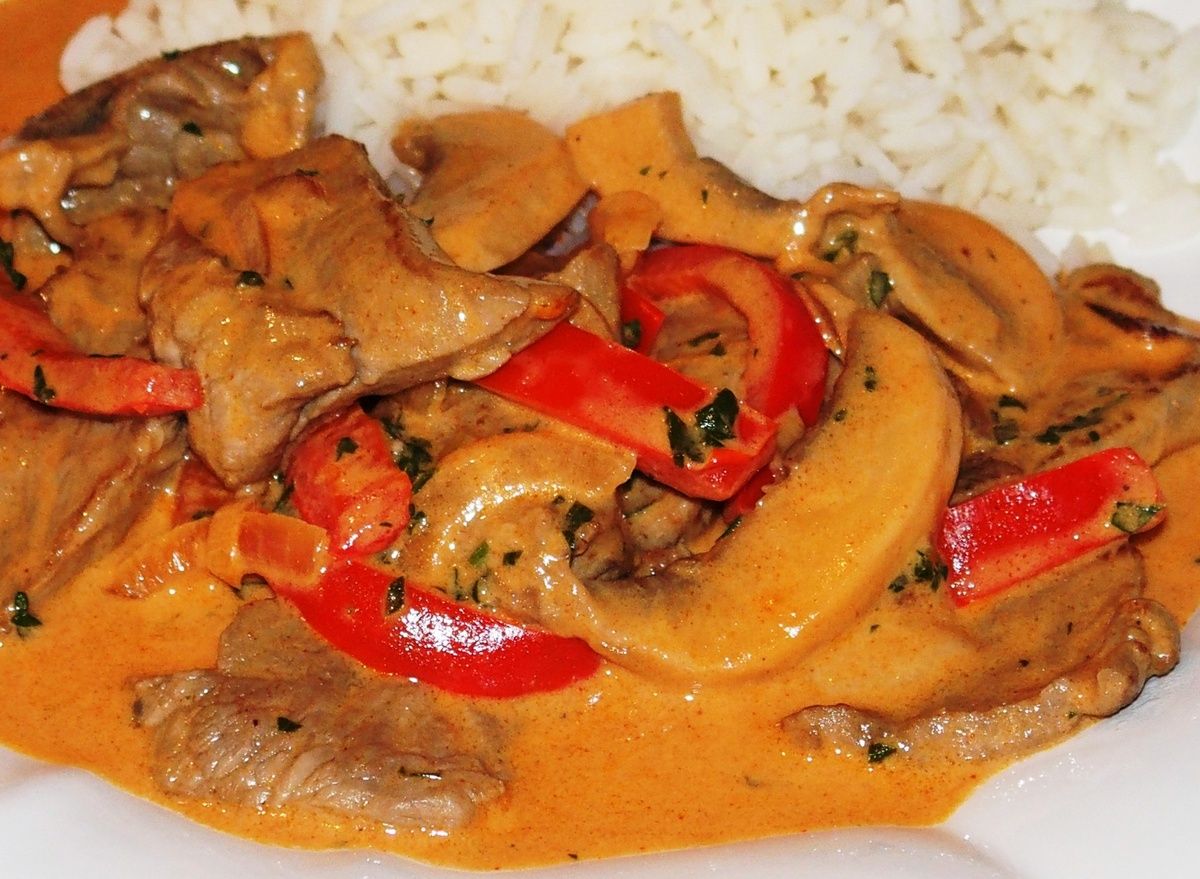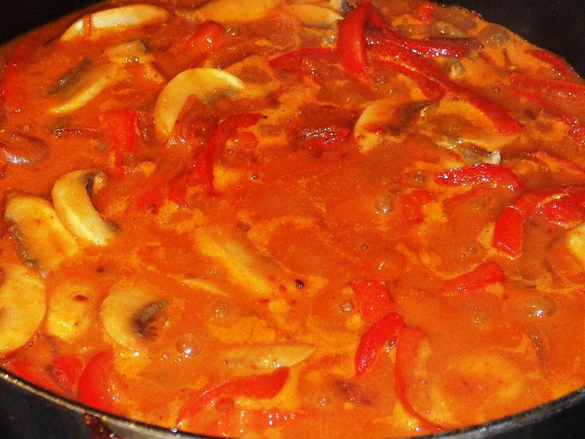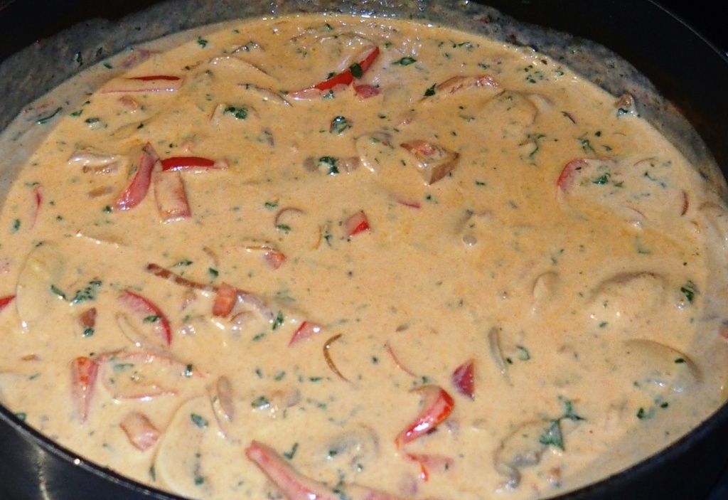 5) Ajouter la crème et le persil. Cuire encore jusqu'à l'ébullition puis goûter et rectifier l'assaisonnement en sel ou paprika si vous aimez ce qui est épicé. Ajouter la viande pour la réchauffer 2 minutes sur feu très doux, pas plus!