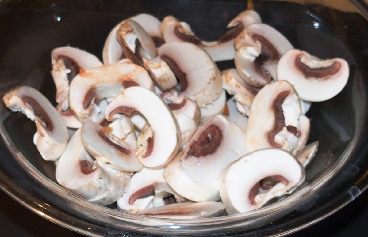 2) Peler et émincer l'oignon rouge en lamelles. Couper également le poivron en fines lamelles et mettre avec l'oignon dans un bol. Essuyer les champignons de Paris avec du papier ménage, couper la base des pieds et couper en lamelles pas trop fines. Réserver dans un bol.