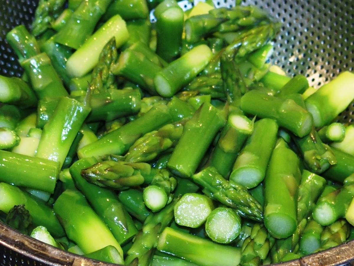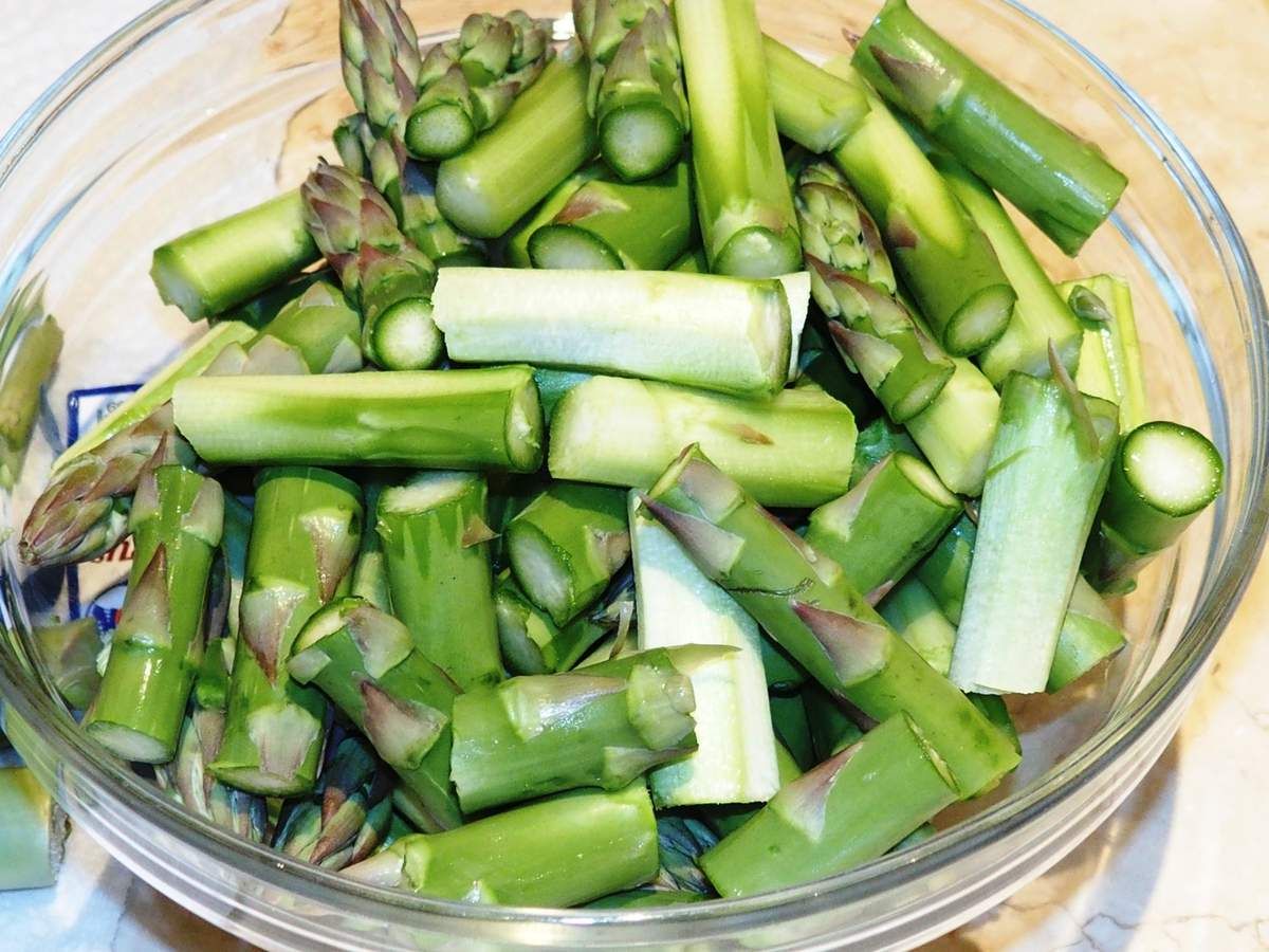 3) Couper environ 3 cm de la queue des asperges et jeter. Peler les asperges sur environ 4 cm restants des queues. Couper les asperges en tronçons de 3 cm (de la taille des penne) et rincer à l'eau froide. Dans une casserole d'eau bouillante salée, plonger les asperges 3 minutes. Puis les passer immédiatement sous un filet d'eau très froide pour qu'elles conservent leur belle couleur. Egoutter et réserver.