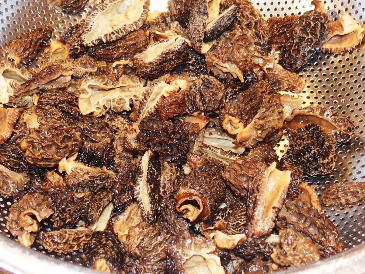 1) Remplir un bol d'eau froide (environ 5 dl) et faire tremper les morilles plusieurs heures ou au mieux, la veille. Conserver environ 2dl de l'eau trempage et la filtrer dans un récipient à travers une passoire fine. Conserver. Couper les plus grosses morilles en deux dans la longueur et les passer sous l'eau froide pour bien les nettoyer. Egoutter. Réserver.