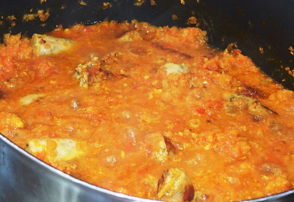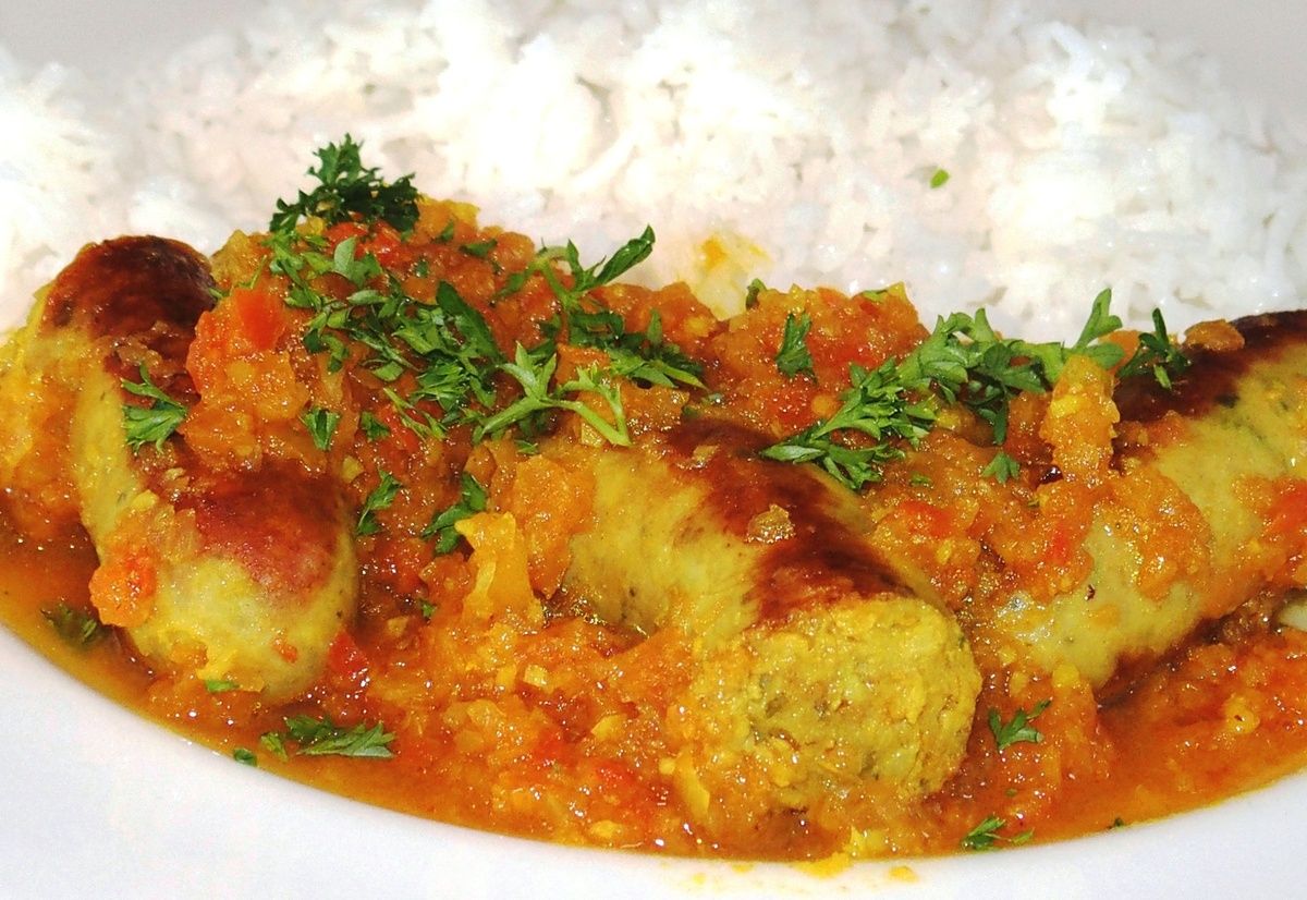 4) Plonger les saucisses dans la casserole du cari et laisser mijoter encore environ 15 minutes sur feu doux. Goûter et rectifier l'assaisonnement en sel si nécessaire. Servir avec du riz parfumé et un peu de coriandre ciselée (ou du persil).
