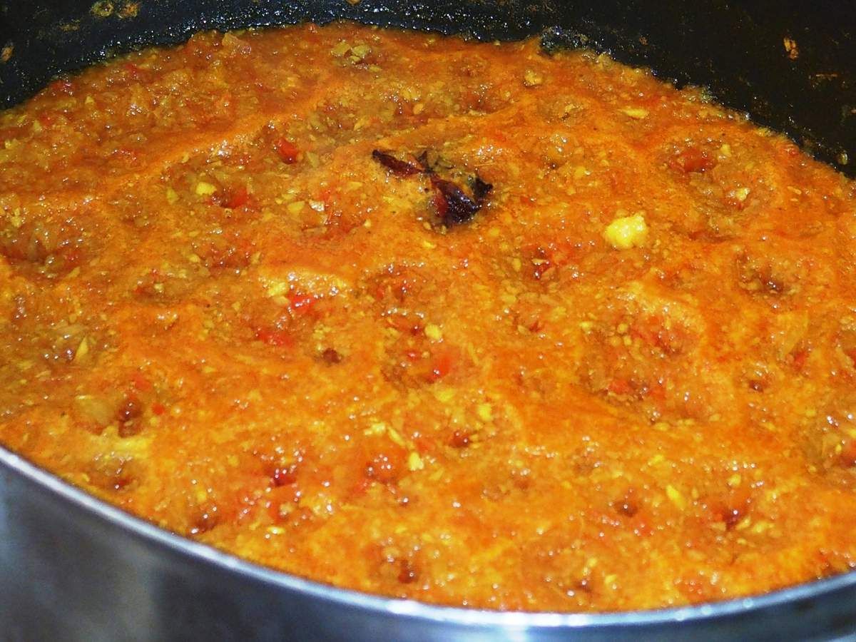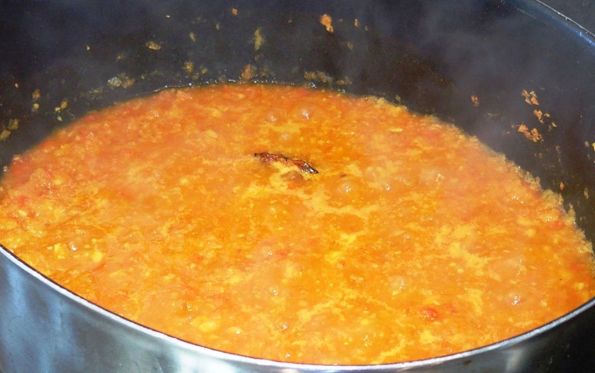 1) Peler le gingembre et le couper en gros morceaux. Mettre dans le bol du mixeur. Peler et couper les oignons et les gousses d'ail grossièrement et ajouter dans le bol. Laver et couper les tomates également en gros morceaux et ajouter. Mixer afin d'obtenir une pâte homogène.