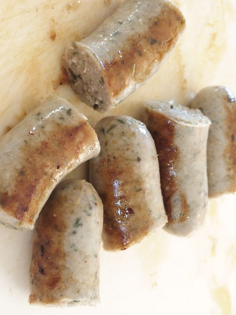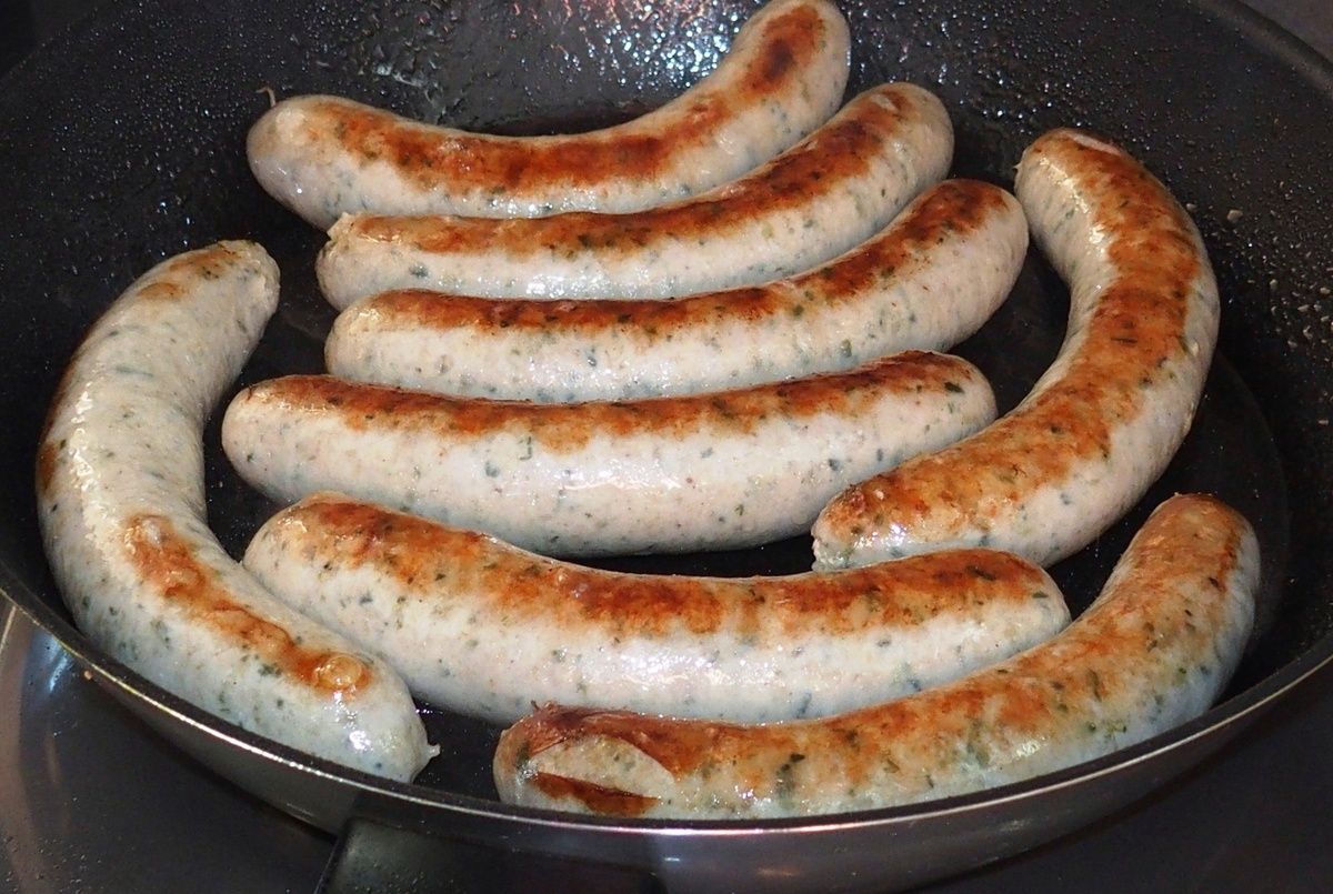 3) Pendant ce temps, porter à ébullition une casserole remplie d'eau avec les saucisses. Cuire ainsi 5 minutes puis retirer les saucisses et les faire revenir dans une poêle avec de l'huile à rôtir en les retournant à mi-cuisson pendant 5 à 10 minutes. Sortir les saucisses et les couper en tronçons d'environ 4cm.
