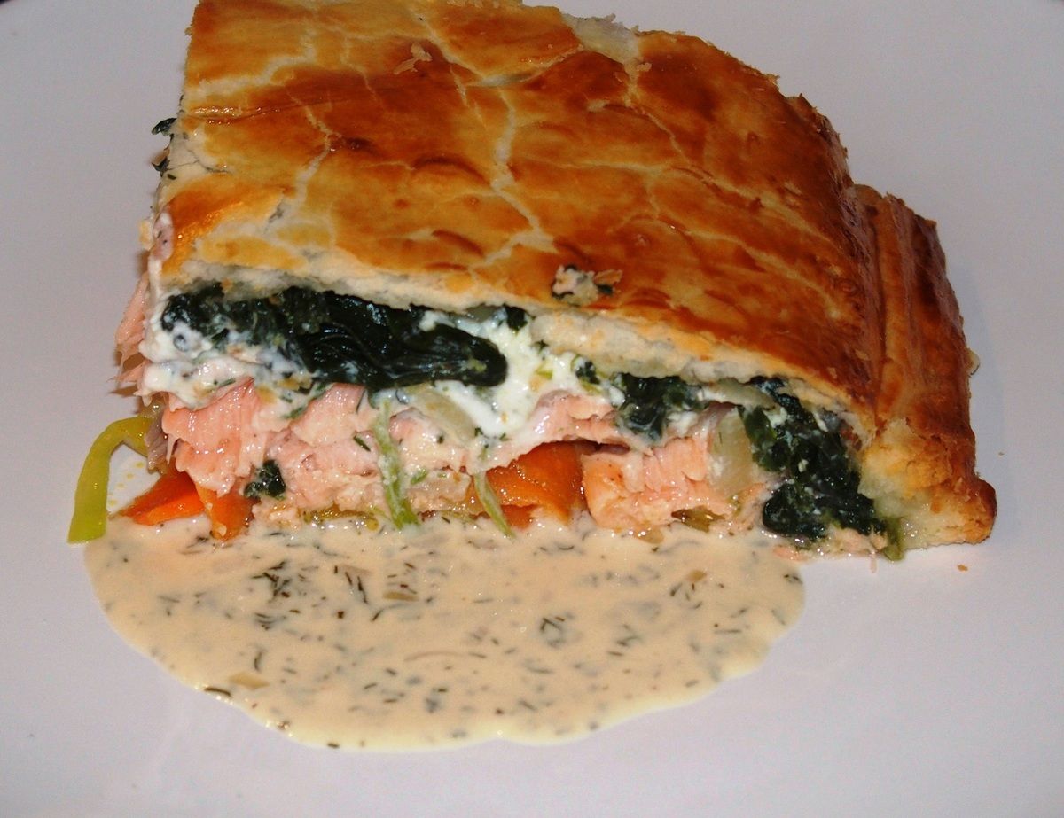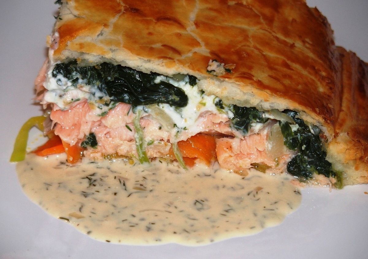 10) Sortir le saumon en croûte du four et laisser reposer 5 minutes. Réchauffer la sauce. Servir de jolies tranches avec un peu de sauce à l'aneth et une salade verte.