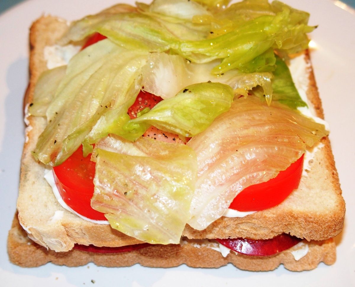 2) Montage : un toast tartiné du mélange roquefort-Philadelphia, les rondelles de pommes, un toast tartiné de mayonnaise, les rondelles de tomate, sel et poivre, la salade, les cerneaux de noix et un toast tartiné de mayonnaise. Coupez en diagonale et hop, plantez un grand cure-dents dans chaque triangle