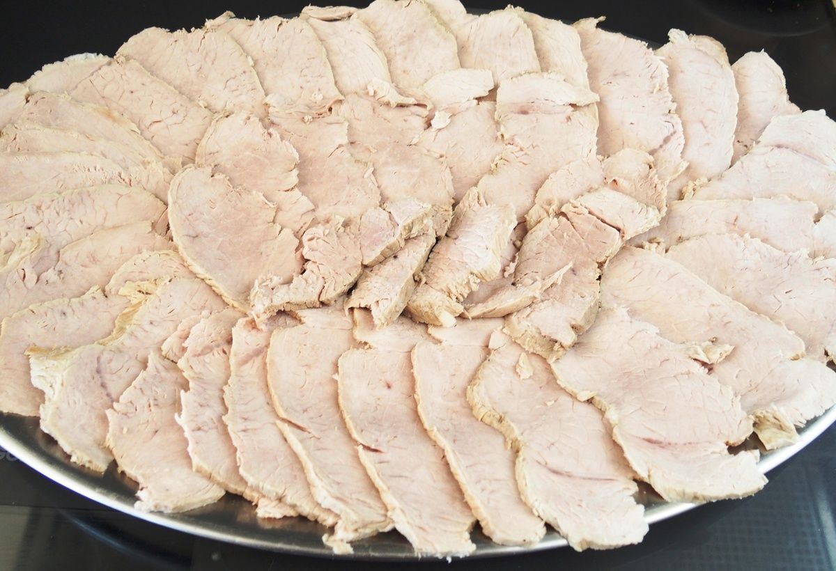 4) Couper le veau en tranches fines. L'idéal est d'utiliser une trancheuse. Sinon, le couper vraiment finement et disposer les tranches dans un plat, comme ça: