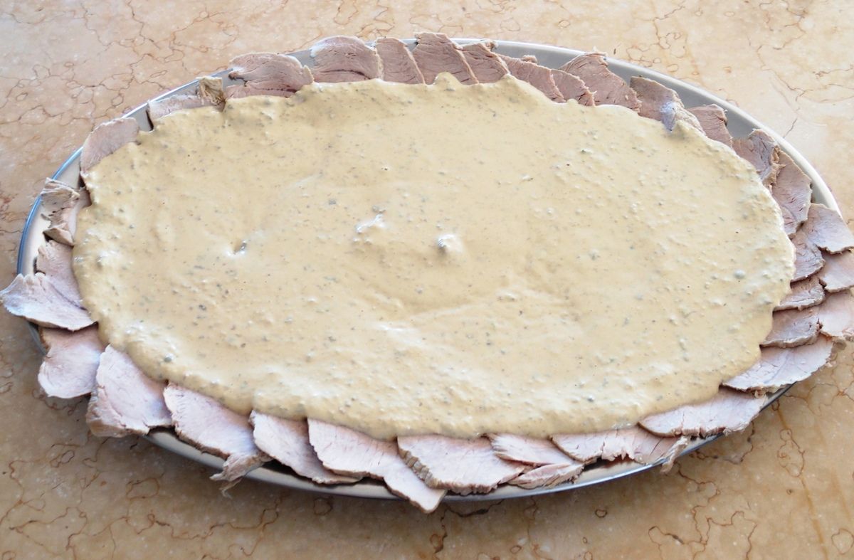 5) Recouvrir les tranches avec la sauce au thon en laissant libres les bords, c'est plus joli (enfin, moi je trouve). Mettre au réfrigérateur jusqu'au moment de servir (au moins 2 à 3 heures, pour que le tout soit bien frais et que la viande prenne tous les goûts de la sauce).