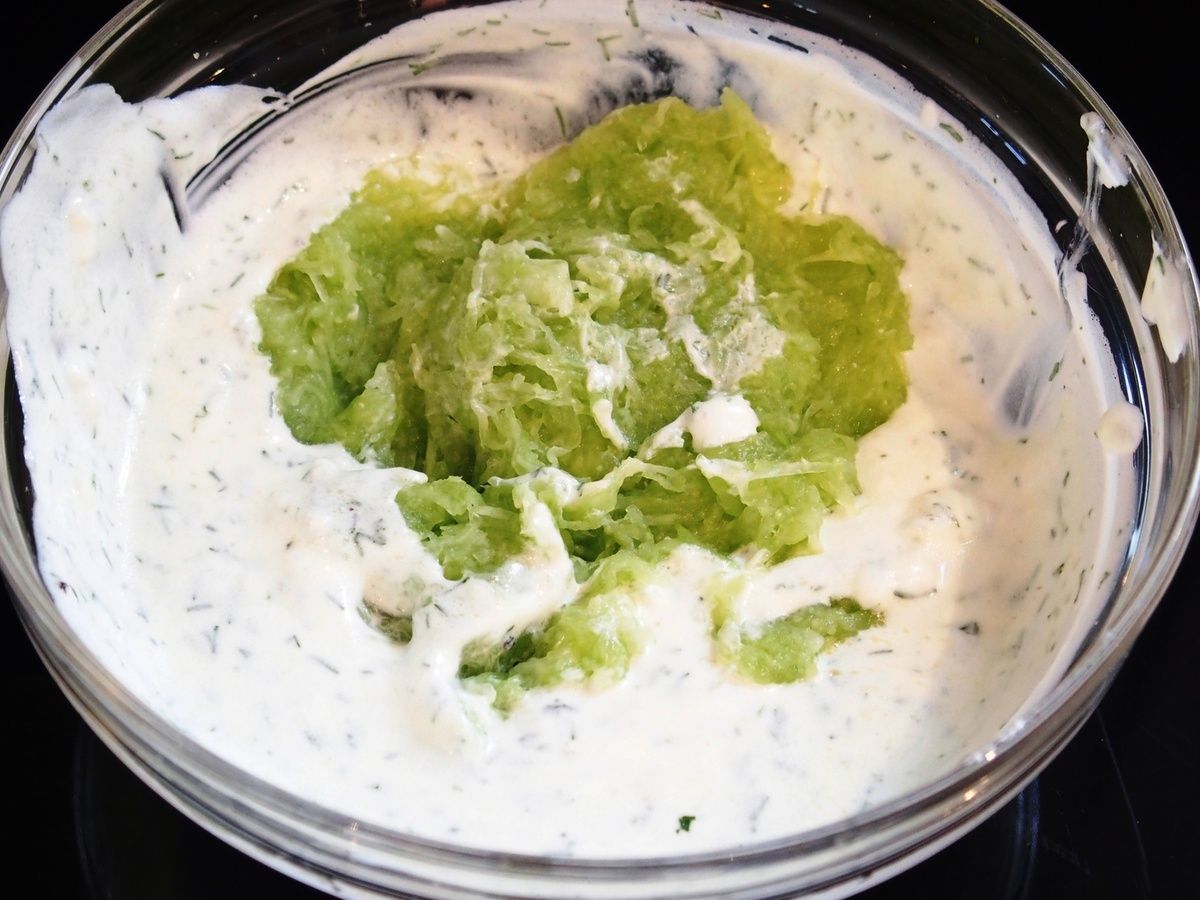 1) Peler les concombres puis les râper à la râpe fine. Les mettre dans une passoire au-dessus de l’évier avec une pincée de sel, mélanger et laisser égoutter au moins 15 minutes.