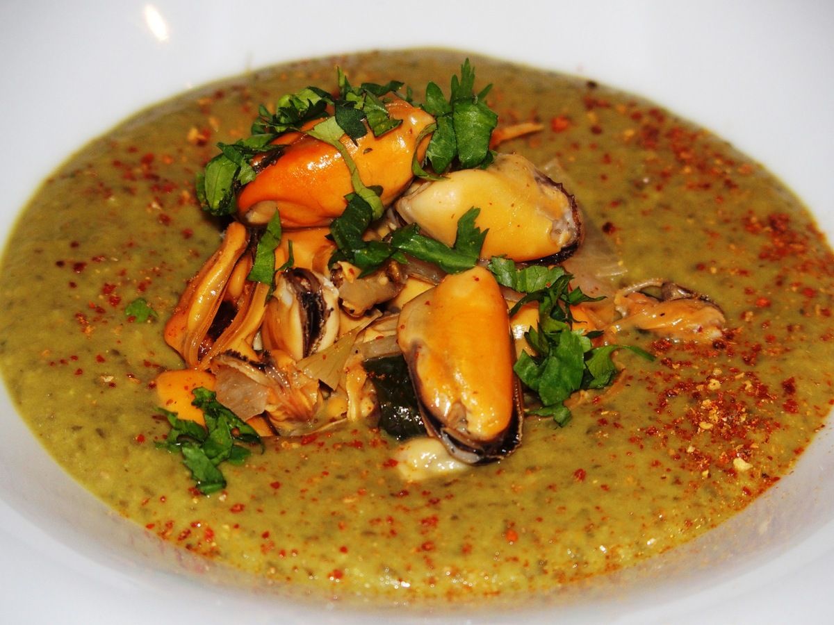 8) Verser le velouté dans des assiettes creuses, mettre les moules au centre et parsemer de piment d'Espelette et de coriandre ou de persil.