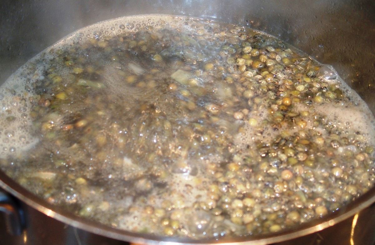 4) Préparer le velouté de lentilles: hacher l'oignon, peler le gingembre et le couper en petits morceaux. Dans une casserole, faire chauffer un peu d'huile et faire revenir le gingembre et l'oignon sur feu moyen. Ajouter les lentilles ainsi que de l'eau de façon à ce qu'elle arrive un bon centimètre au-dessus des lentilles. Ajouter le cube de bouillon, poivrer. Laisser cuire à découvert environ 30 minutes depuis l'ébullition sur feu moyen jusqu'à ce que les lentilles soient cuites et réserver. Ajouter un peu d'eau si nécessaire en cours de cuisson. A la fin, il ne devrait plus en rester lorsqu'elles sont cuites.