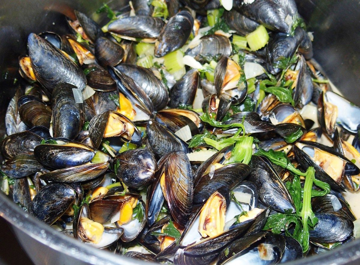 3) Dans une grande casserole, mettre un bon filet d'huile d'olive et faire chauffer. Faire revenir l'ail, l'oignon et le céleri en mélangeant durant quelques minutes. Saler et poivrer. Ajouter les moules. Verser le vin blanc. Mélanger délicatement. Couvrir et cuire ainsi à feu moyen durant environ 5 minutes en mélangeant régulièrement. Ajouter le persil haché. Quand les moules sont bien ouvertes, elles sont prêtes! Laisser les moules tiédir dans la casserole.