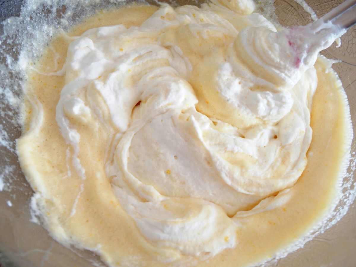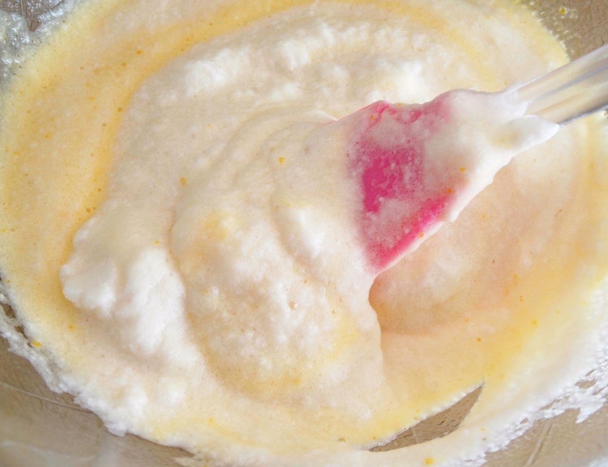 3) Dans le récipient contenant les jaunes, ajouter 50g de sucre et mélanger au fouet. Ajouter les blancs d’œufs petit à petit et mélanger à l’aide d’une spatule délicatement afin de ne pas casser les blancs.
