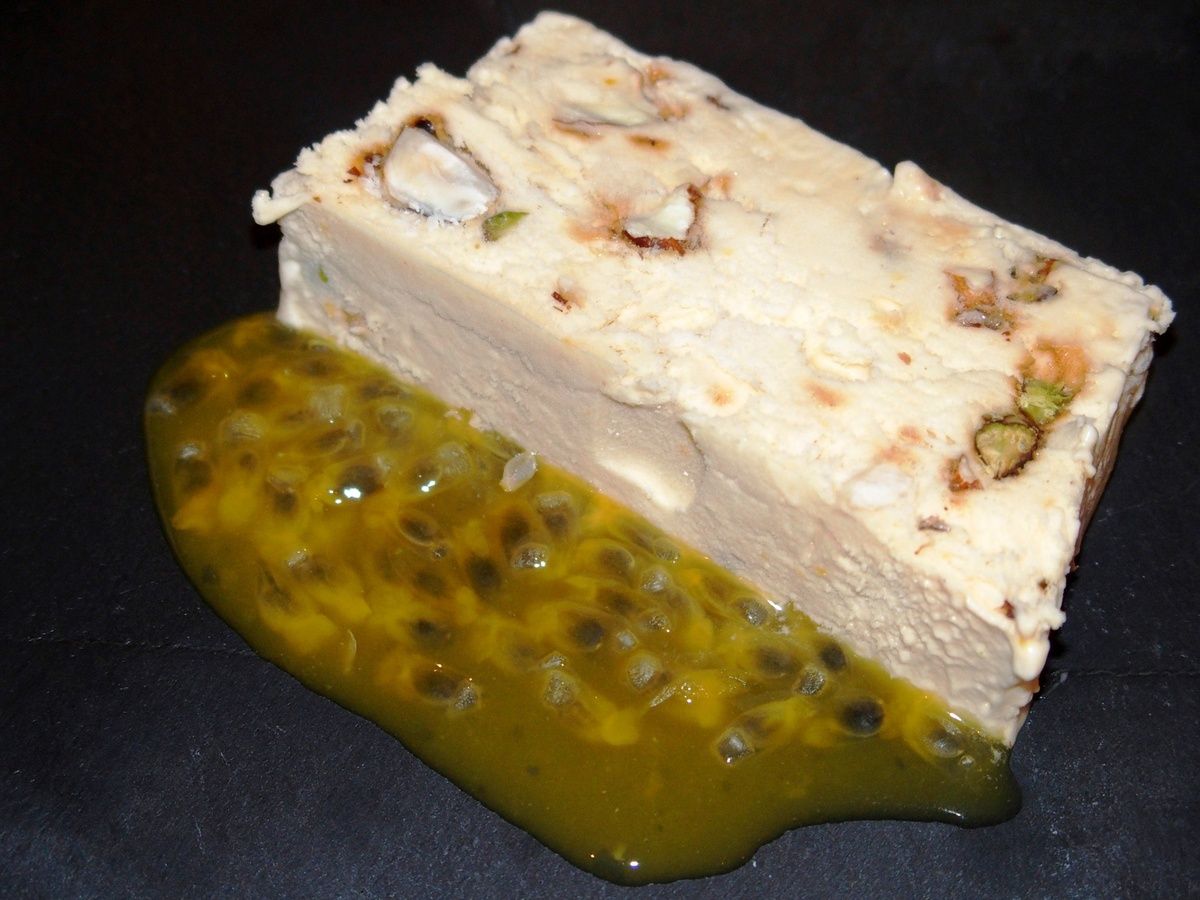 6) Le jour J, préparer le coulis : délayer la fécule dans le jus de l’orange que vous aurez pressée. Verser dans une casserole et ajouter le sucre. Porter à ébullition et laisser le coulis épaissir deux minutes. Couper les fruits de la passion en deux, prélever la pulpe avec une cuillère. Retirer la casserole du feu et ajouter la pulpe. Mélanger et laisser refroidir. Sortir le nougat glacé du congélateur 5 minutes avant de servir. Passer un couteau sur les bords et le retourner sur une planche. Couper de belles tranches et verser un peu de coulis à côté ou dessus.