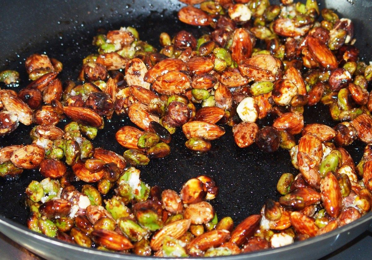 1) Dans une poêle, verser les amandes, les noisettes et les pistaches. Saupoudrer de 50g de sucre. Sur feu moyen, faire caraméliser durant une dizaine de minutes en mélangeant souvent. Réserver et laisser tiédir sur une planche. Concasser finement à l’aide d’un grand couteau les noisettes, les amandes et les pistaches.