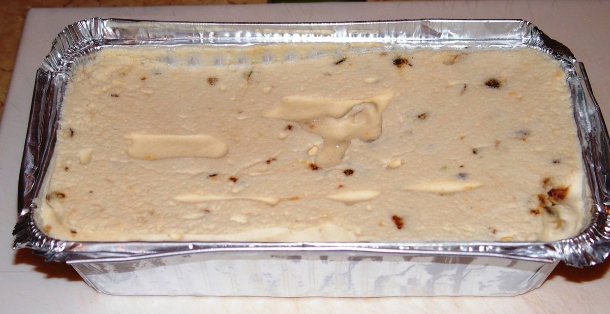 Pour les quantités données, j'ai rempli 2 bacs en alu de 0,9 litre. Donc pour une douzaine de tranches en tout. Vous pouvez utiliser un gros moule à cake recouvert de papier film pour un démoulage facile. A faire la veille ou l'avant-veille!