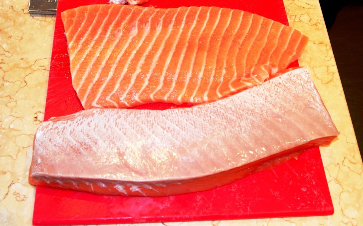 2) Ajouter 2 litres d'eau, le cube de bouillon et porter à ébullition. A l'ébullition, baisser à frémissements et ajouter délicatement le ou les filets de saumon. Laisser cuire ainsi 10 minutes. Réserver le saumon dans un récipient (sans la garniture) et laisser refroidir.