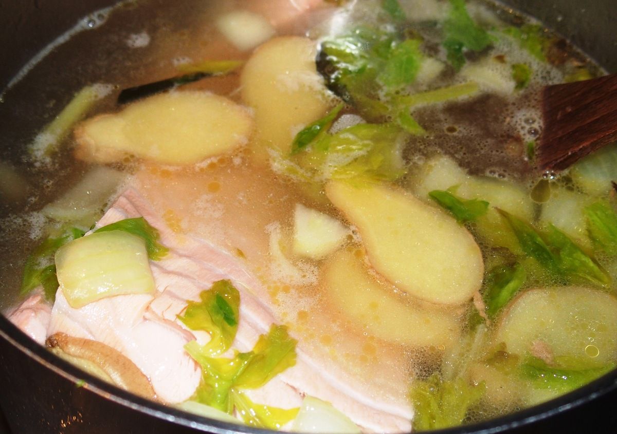 1) Dans une casserole, mettre le gingembre coupé en gros morceaux (pas besoin de le peler). Ecraser un peu la tige de citronnelle avec le plat d'un couteau sur une planche et ajouter. Peler et couper grossièrement l'oignon. Ajouter dans la casserole. Couper la branche de céleri en morceaux et ajouter. Mettre un filet d'huile d'olive dans la casserole et faire revenir le tout à feu moyen-vif 2 minutes.