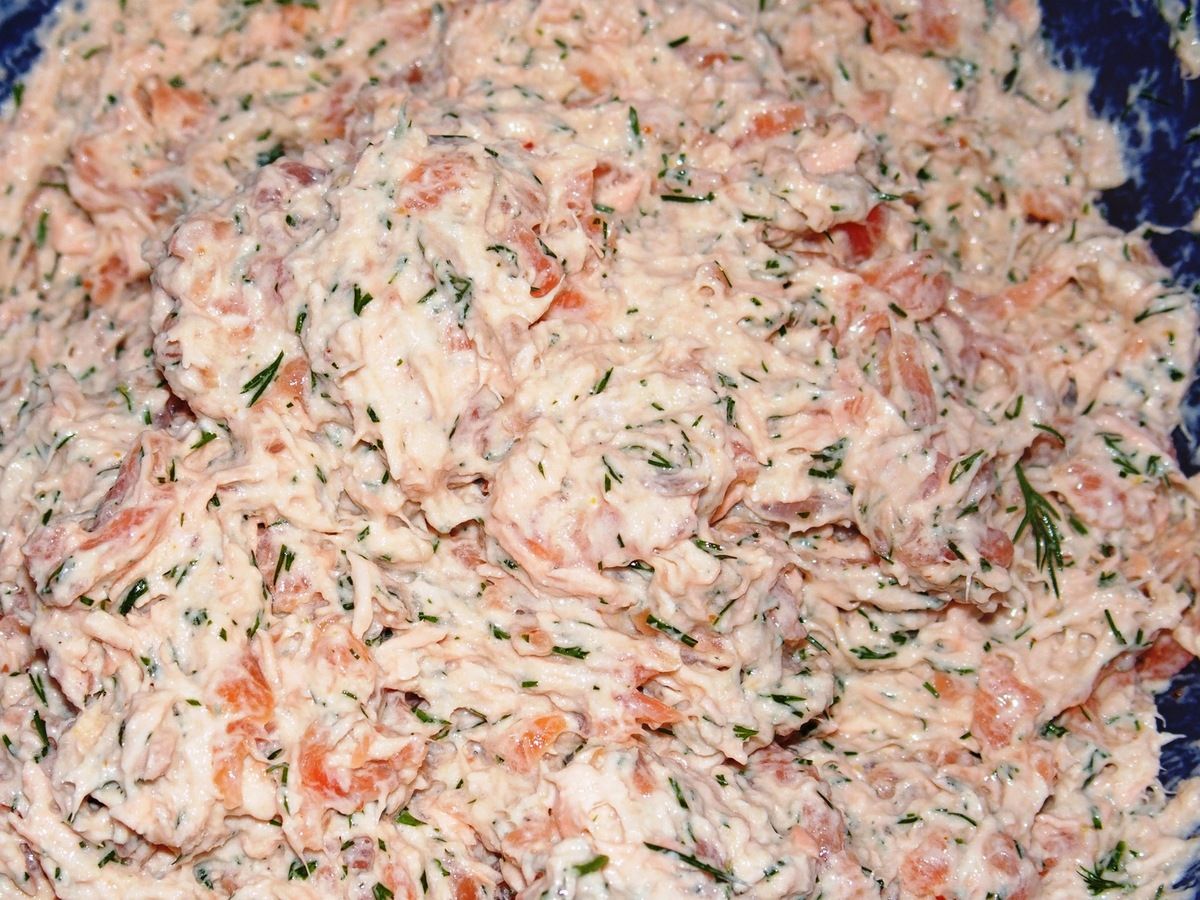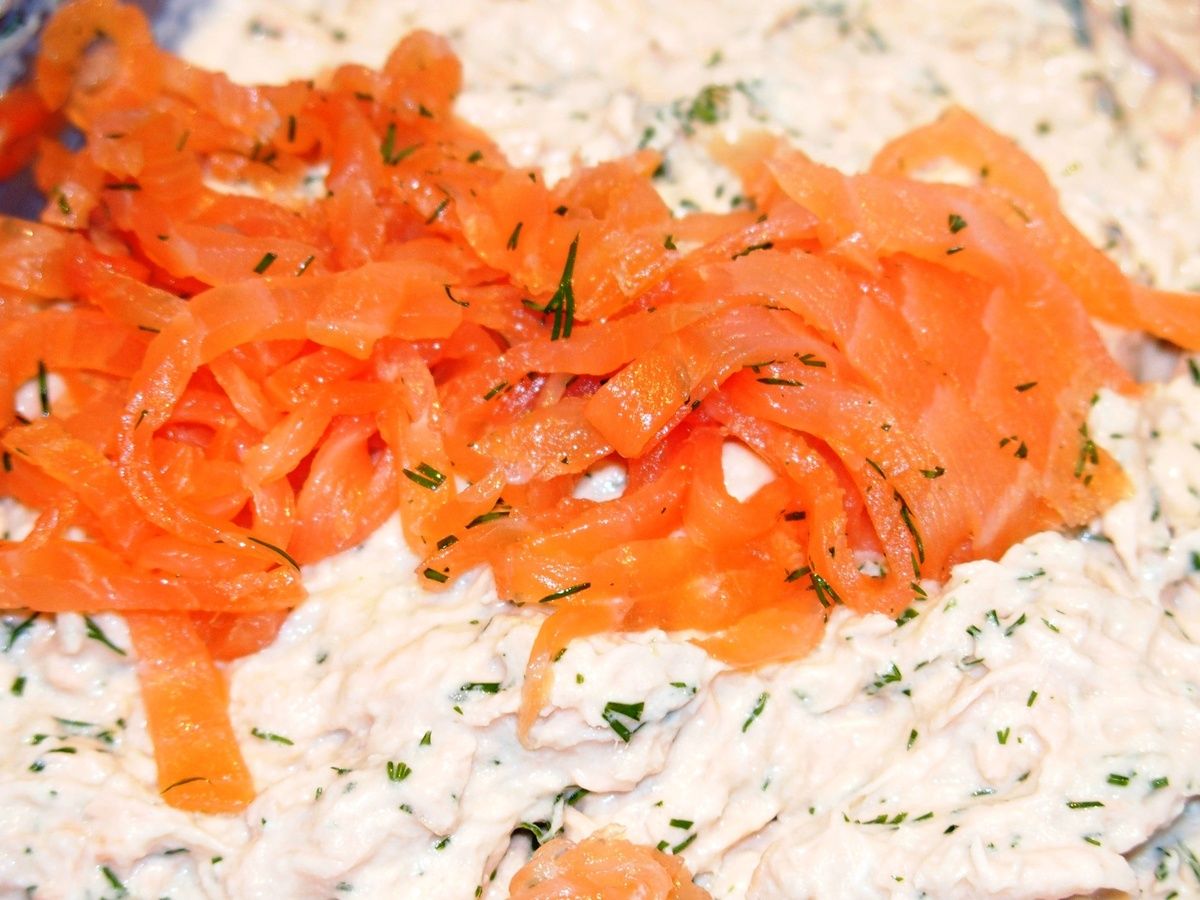 3) Lorsque le saumon est froid, retirer la peau s'il y en a. Puis effilocher les filets finement à l'aide de deux fourchettes. Ajouter le yaourt et le Philadelphia. Mélanger. Ciseler l'aneth finement et ajouter. Couper le saumon fumé en fines lanières et ajouter également.