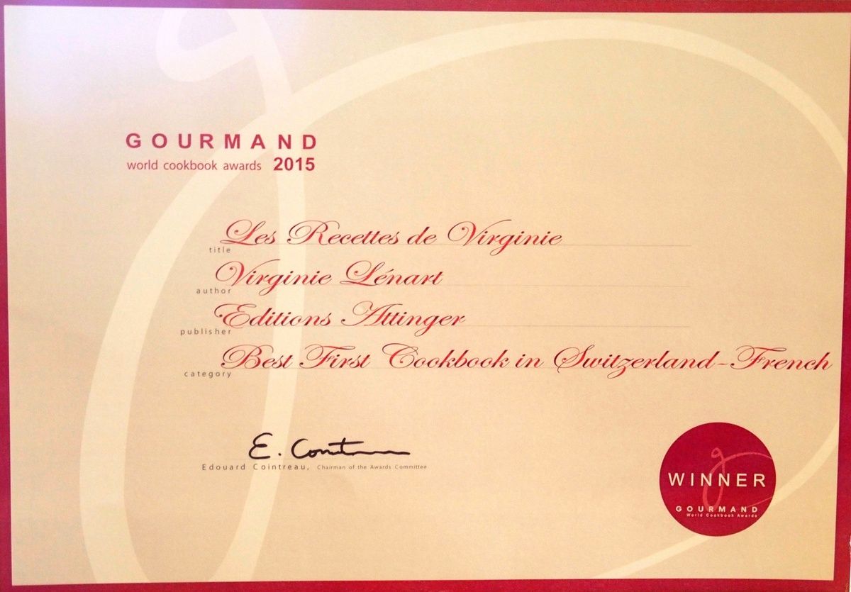Je suis trop contente. J'ai reçu ce matin mon certificat des Gourmand Awards pour le "Meilleur premier livre de cuisine" 2015 en Suisse romande.