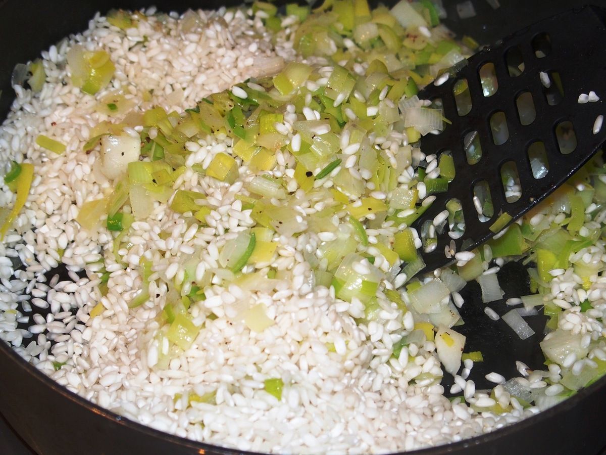 4) Dans une poêle haute, mettre 20g de beurre à fondre, puis ajouter l'oignon. Sur feu moyen-vif, mélanger 1 minute. Ajouter les poireaux. Poivrer. Mélanger ainsi 5 minutes, sur feu moyen. Ajouter le riz et mélanger 1 minute. Verser le vin blanc. Faire réduire complètement.