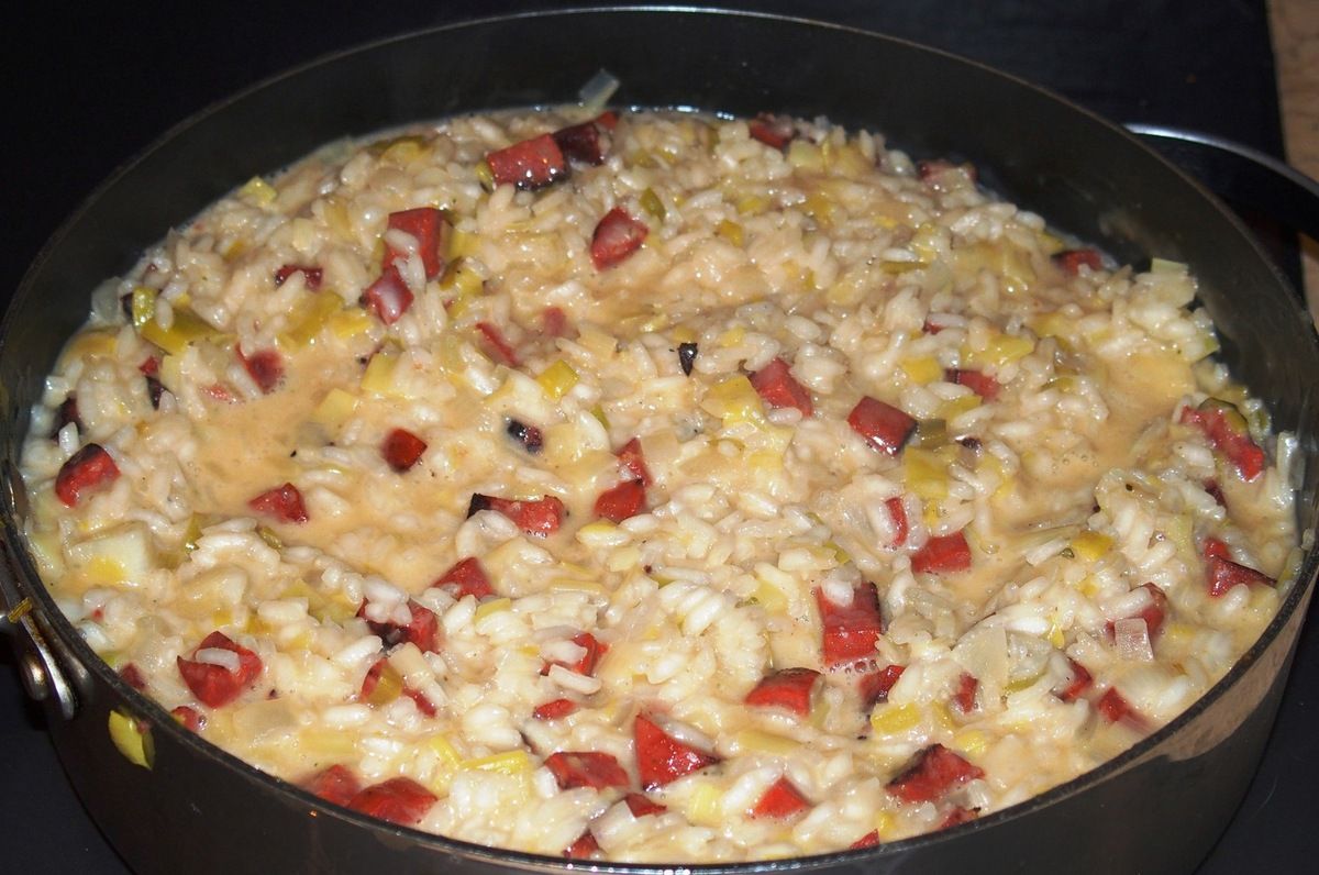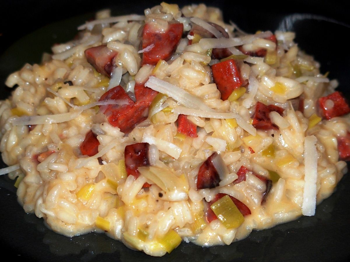 Vous aimerez j'en suis certaine, ce petit risotto moelleux aux poireaux avec ce goût typique de chorizo. Un délice!