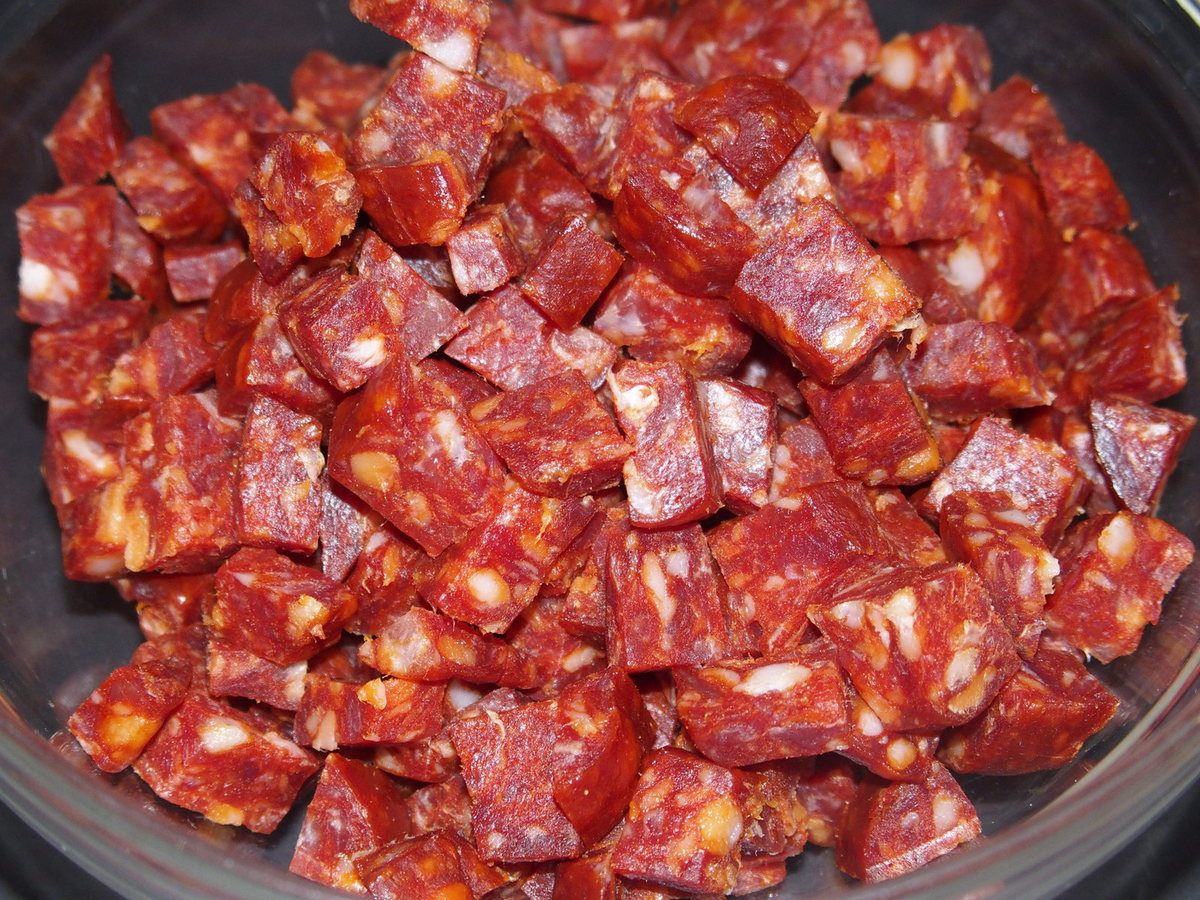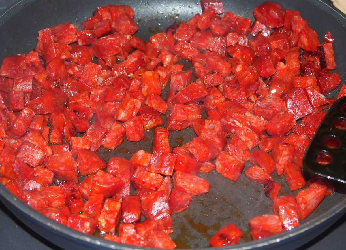 2) Peler les chorizos et les couper en petits dés. Dans une poêle sans matière grasse, faire dorer les morceaux de chorizos environ 5 minutes en mélangeant souvent. Puis égoutter les morceaux sur du papier ménage afin d'éliminer le maximum de graisse.