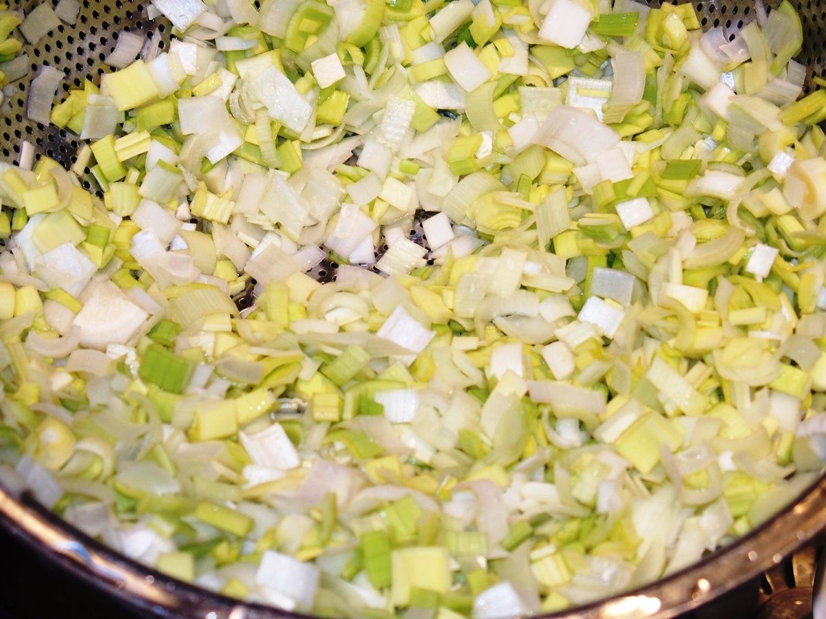 1) Couper le poireau à la hauteur des feuilles (laisser un tout petit peu de vert). Ne pas utiliser les feuilles. Couper le poireau en deux dans la longueur, puis toujours dans la longueur en plusieurs fois. Couper ensuite dans la largeur finement. Mettre dans une passoire et rincer à l'eau froide. Laisser égoutter.