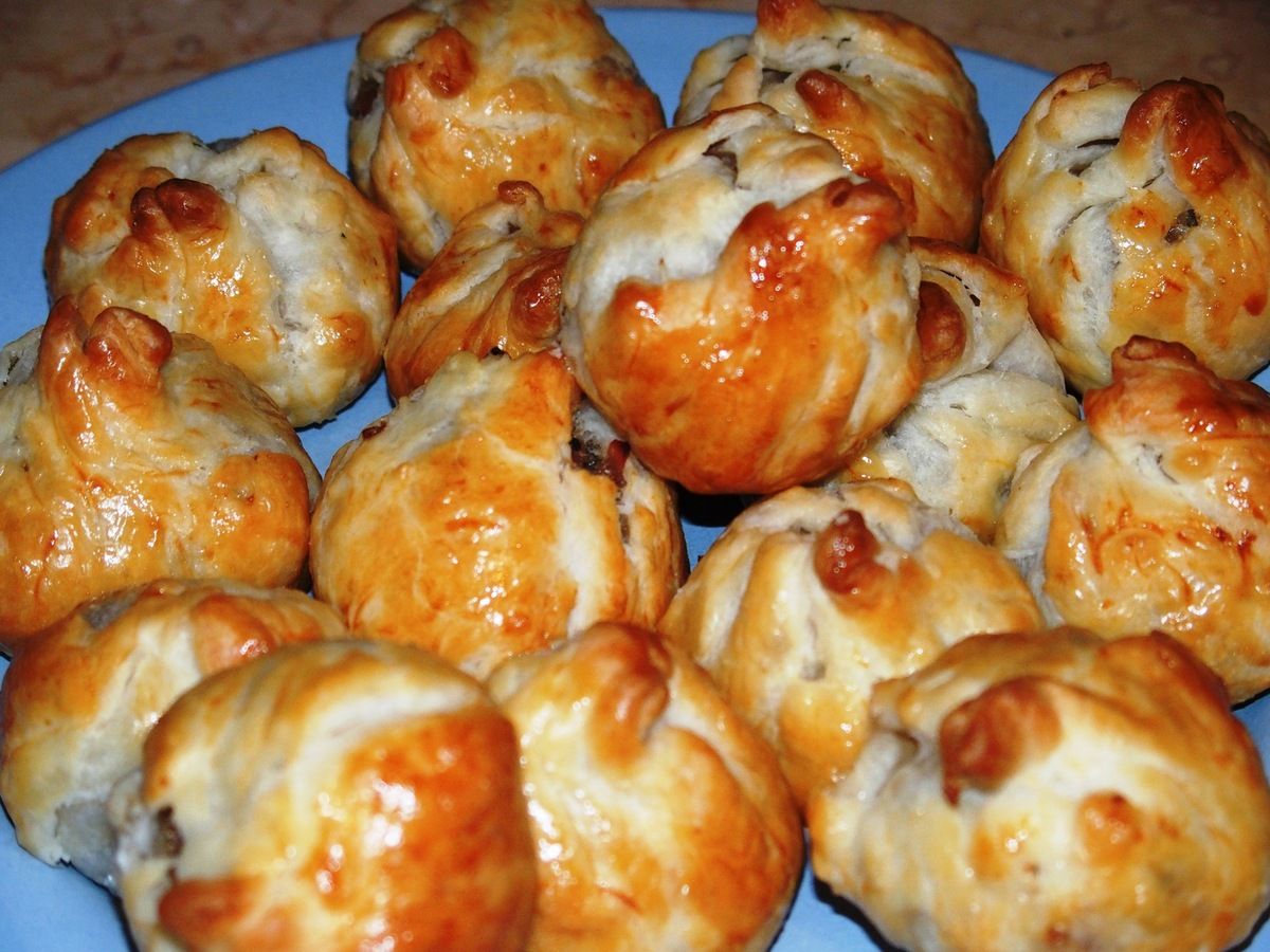 4) Préchauffer le four à 200°C. Disposer l'abaisse de pâte sur le plan de travail et découper des carrés dans cette pâte d'environ 8cm de côté, à l'aide d'un emporte-pièce. Déposer une boule de viande au centre de chaque carré. Rabattre la pâte au centre pour réunir les côtés du carré et souder avec les doigts puis tourner la pâte en spirale pour donner une forme de bonbon sur le dessus. Mélanger le jaune d'oeuf avec un peu de lait et dorer chaque feuilleté de toutes parts. Enfourner au milieu du four préchauffé à 200°C pour 20 à 25 minutes, jusqu'à ce que les feuilletés soient dorés. Servir chauds, tièdes ou froids!