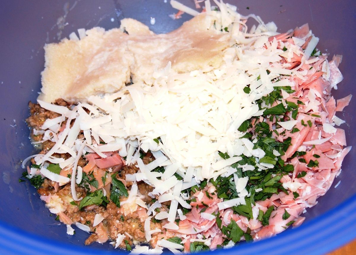 2) Hacher finement la mortadelle et mettre avec la viande. Hacher le persil et ajouter. Ajouter le parmesan ainsi que les 2 oeufs préalablement battus. Essorer le pain de mie entre les doigts et ajouter, ainsi que la chapelure. Bien mélanger le tout. Saler et poivrer.