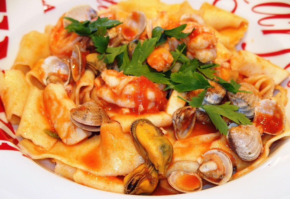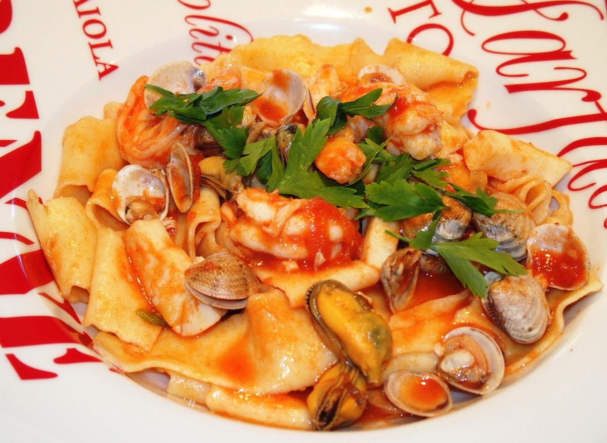 4) Mettre le jus des moules dans la casserole du fond de poisson après 1 heure de cuisson. Passer le tout à travers un chinois ou une passoire fine. Remettre 6 dl dans la casserole. Ajouter le coulis de tomate et porter à ébullition. Baisser le feu et laisser mijoter 10 minutes. Ajouter tout d'abord les anneaux de calamars (coupés en morceaux ou non). Après 5 minutes, ajouter les vongoles, les crevettes et les morceaux de poisson. 5 minutes plus tard, lorsque les vongoles sont ouvertes, les crevettes roses et les morceaux de poisson cuits, ajouter les moules décortiquées et cuire encore 1 minute. Goûter et rectifier l'assaisonnement. Mélanger immédiatement la sauce avec des pâtes al dente et parsemer d'un peu de persil. Servir.