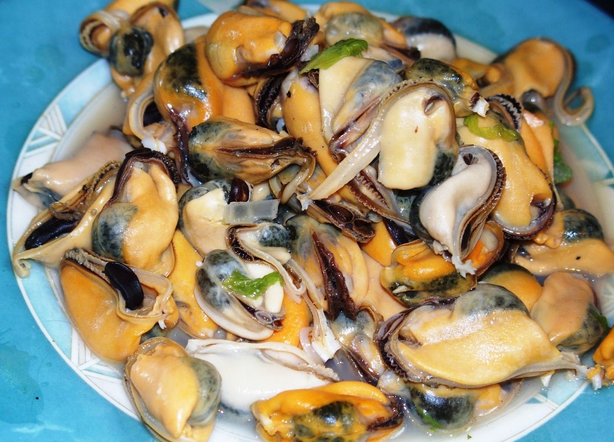 3) Pendant ce temps, préparer les moules: remplir la moitié de l'évier avec de l'eau froide et une poignée de sel. Y mettre les moules et brasser avec les mains. Jeter les moules ouvertes ou cassées. Gratter les moules avec un petit couteau pour les nettoyer si nécessaire. Egoutter. Hacher l'oignon et l'ail. Couper en petits morceaux les branches de céleri avec les feuilles. Hacher le persil grossièrement. Dans une grande casserole, mettre un bon filet d'huile d'olive et faire chauffer. Faire revenir l'ail, l'oignon et le céleri en mélangeant durant quelques minutes. Saler et poivrer. Ajouter les moules. Verser le vin blanc. Mélanger délicatement. Couvrir et cuire ainsi à feu moyen durant environ 5 minutes en mélangeant régulièrement. Ajouter le persil haché. Quand les moules sont bien ouvertes, elles sont prêtes! Egoutter en conservant 2dl du jus des moules. Laisser tiédir et décortiquer les moules (nous ne gardons pas les coquilles pour cette recette). Jeter les moules fermées. Réserver. Rincer les vongoles sous l'eau froide. Découper le poisson frais en morceaux.