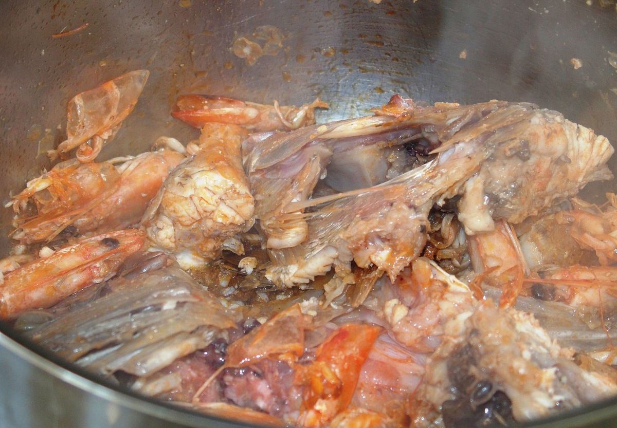2) Préparer le fond de poisson: dans une casserole, faire revenir dans un filet d'huile d'olive les carapaces des crevettes ainsi que les queues et têtes de poisson. Bien les marquer à feu vif, même si le fond attache un peu, pendant 5 minutes en mélangeant. Ajouter tous les légumes du point 1. Faire revenir sur feu moyen-vif en grattant le fond avec la spatule 5 minutes. Ajouter le vin blanc et bien détacher encore le fond avec la spatule. Ajouter les grains de poivre, le bouquet de persil en entier, 1 grosse pincée de sel et 1 litre d'eau. Porter à ébullition, mélanger. Baisser le feu sur feu moyen et laisser réduire à découvert pendant 1 heure.