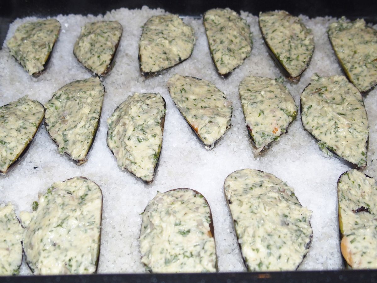4) Lorsque les moules sont tièdes, ôter les coquilles supérieures. Farcir chaque moule avec l'aide d'une cuillère à soupe, afin que la moule soit bien recouverte. Disposer dans un plat à gratin dont le fond est recouvert de gros sel (ainsi les moules resteront bien droites). Préchauffer le four sur position gril.