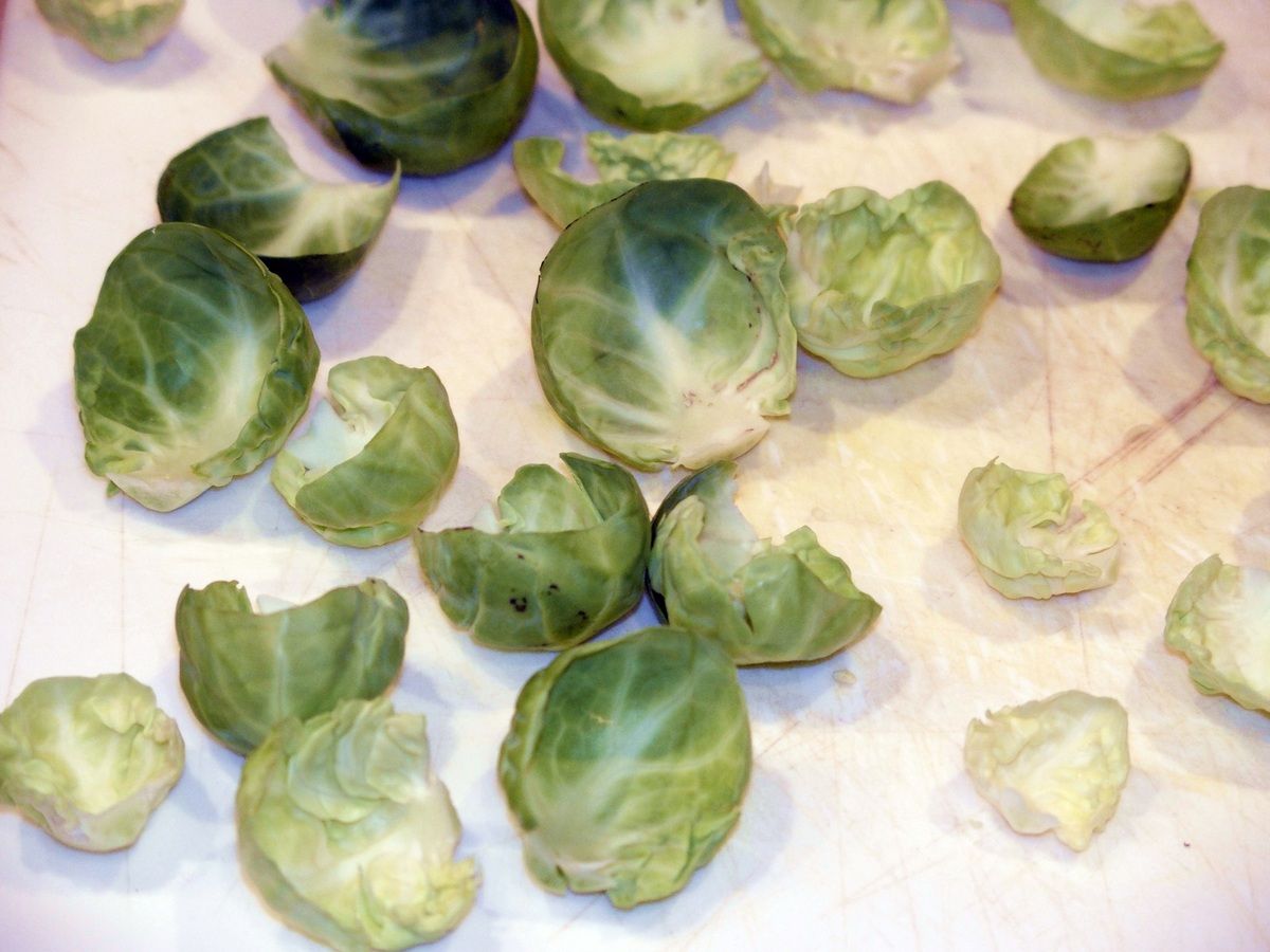 5) Passer les choux de Bruxelles sous l'eau froide. Détacher délicatement de jolies feuilles (une vingtaine). Les faire frire très brièvement (10 secondes max) dans de l'huile bien chaude. Elles ne doivent pas être brunes. Egoutter sur du papier ménage et réserver.