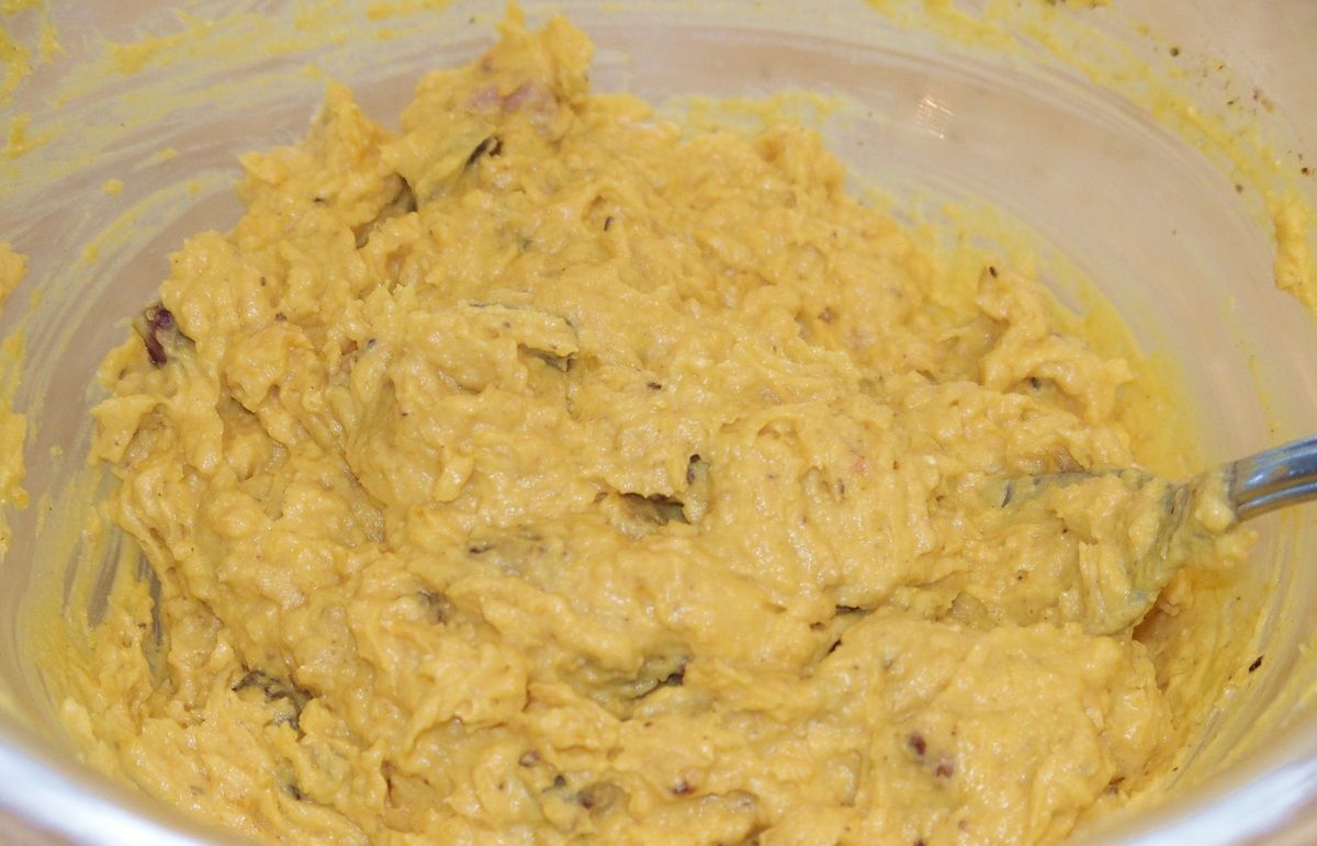 3) Dans un récipient, mettre les tranches de courge (peser pour obtenir environ 180g) et avec une fourchette, réduire en purée. Ajouter la ricotta, les dés de lard, l’œuf et mélanger. Saler légèrement, poivrer et saupoudrer de noix de muscade. Bien mélanger.