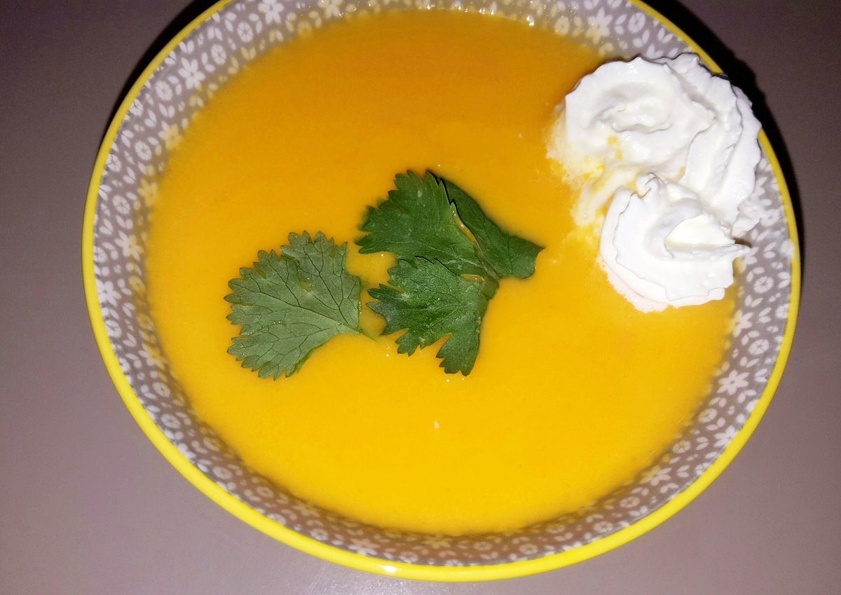 Un velouté aux carottes cuites avec le zeste et le jus d'une orange, du cumin, de l'oignon et gingembre. Un mélange de douceur et de piquant. Sucré, épicé et parfumé comme il faut. Et ça sent bon, si bon l'orange...