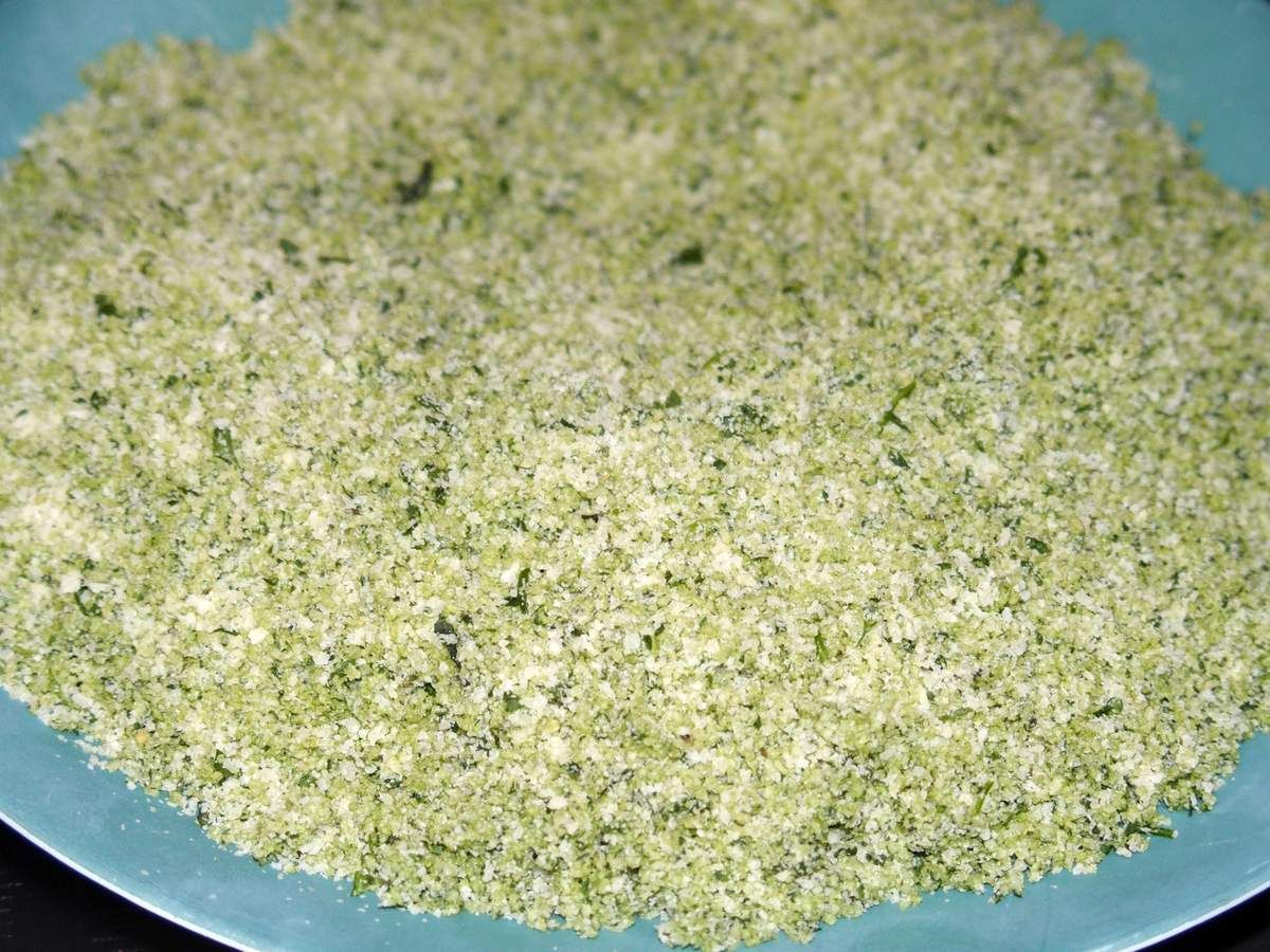 5) Effeuiller le persil et le basilic. Mixer finement la chapelure, le basilic et le persil ensemble. Attention à ce que les herbes soient bien sèches pour éviter que le mélange ne colle. Saler et poivrer et mettre dans une assiette.