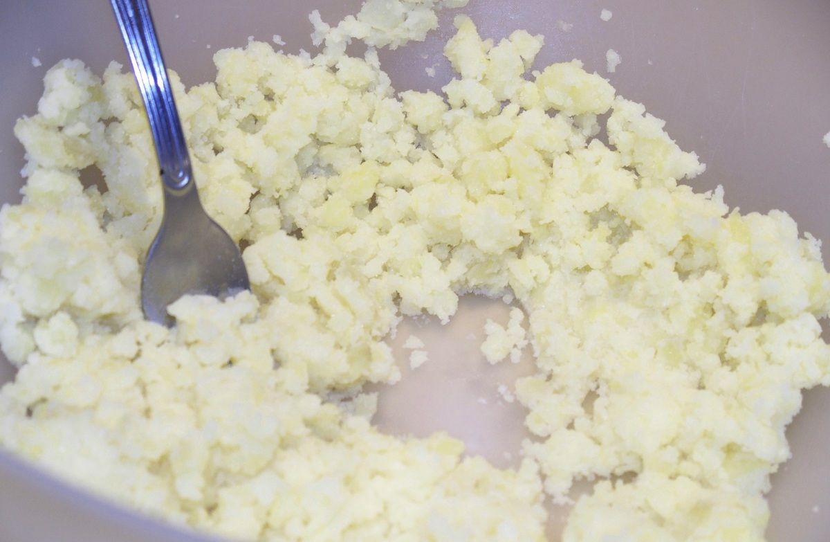 1) Peler les pommes de terre, les couper en dés et les plonger dans une casserole d'eau salée. Porter à ébullition puis baisser le feu. Cuire 10 à 15 minutes jusqu'à ce qu'elles soient tendres. Les égoutter et les laisser tiédir. Les mettre ensuite dans un saladier et les écraser avec une fourchette.
