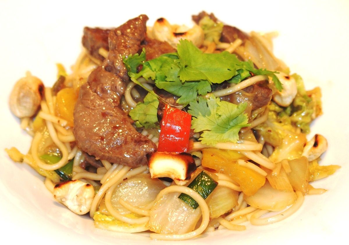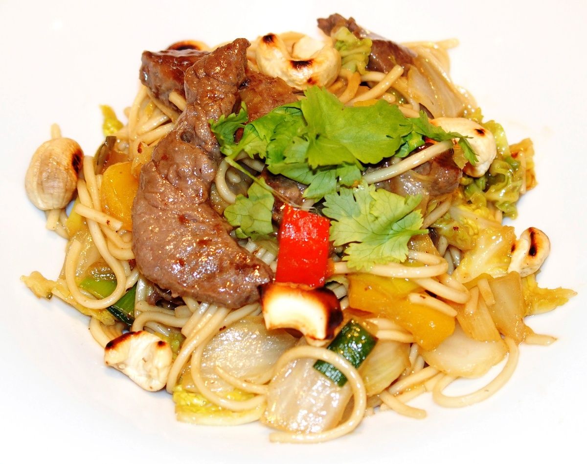 Le lendemain donc, j'ai regardé ces beaux morceaux de viande coupés en grosse allumettes et je me suis dit "Tiens, je vais faire des nouilles chinoises". Comme je suis une fan de la cuisine asiatique, j'en ai toujours dans mon placard (des nouilles donc, pas des asiatiques). Hop un inventaire de mon réfrigérateur et me voilà avec une série de légumes qui ne demandaient qu'à être vite mangés.