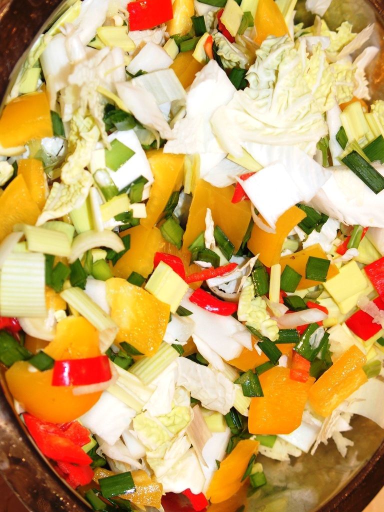 3) Couper tous les légumes: le poivron en carrés, ciseler les oignons de printemps, couper le piment en rondelles, émincer le chou et le poireau. Peler puis râper le gingembre et mettre avec les légumes. Réserver.