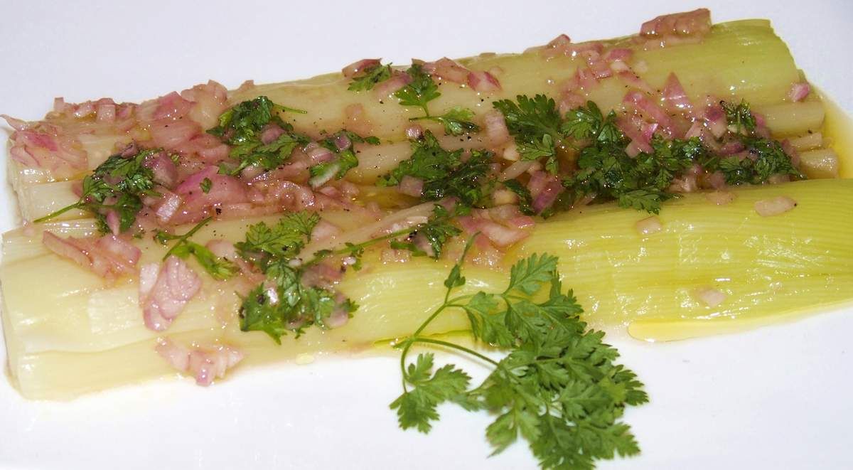 5) Au service, dresser les poireaux sur un plat ou une assiette et verser un peu de vinaigrette au cerfeuil par-dessus.