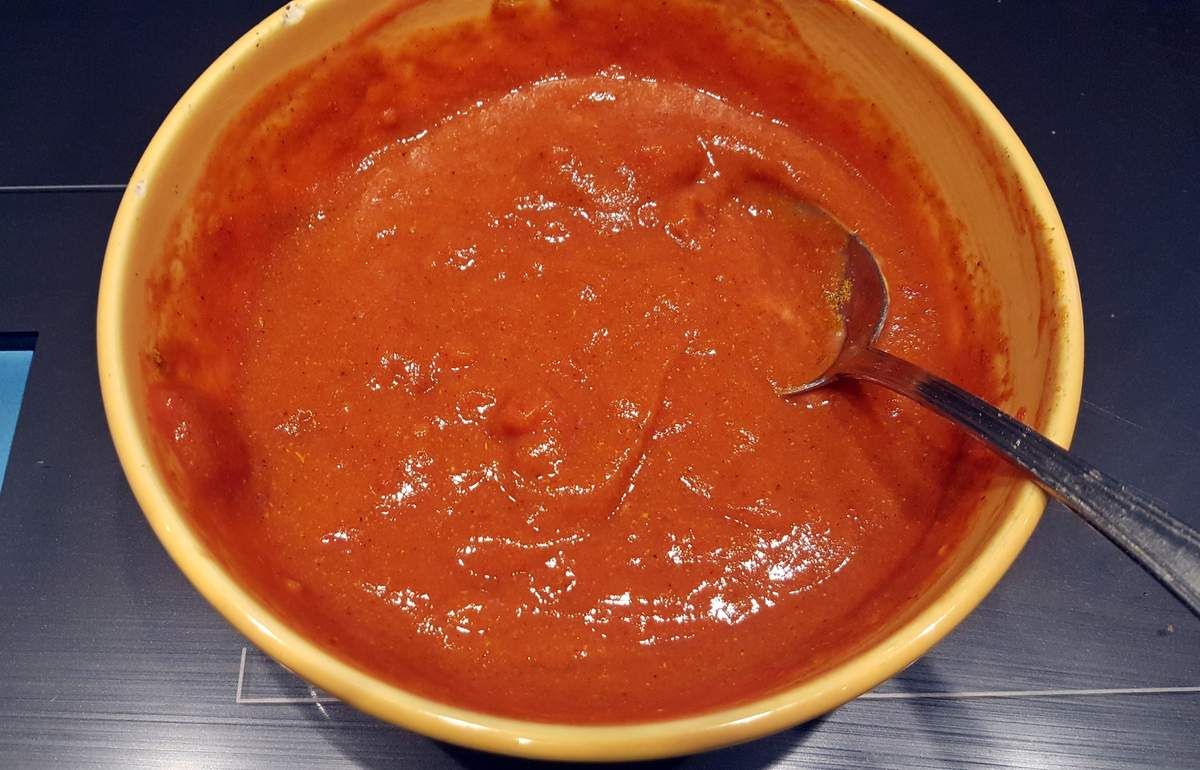 2) Dans un bol, mélanger soigneusement le reste des tomates, soit 100g, le curry, le vinaigre, la moutarde, le ketchup, le sucre et une bonne pincée de sel. Ajouter dans la casserole des tomates et mélanger. Poivrer. Laisser mijoter 15 minutes.