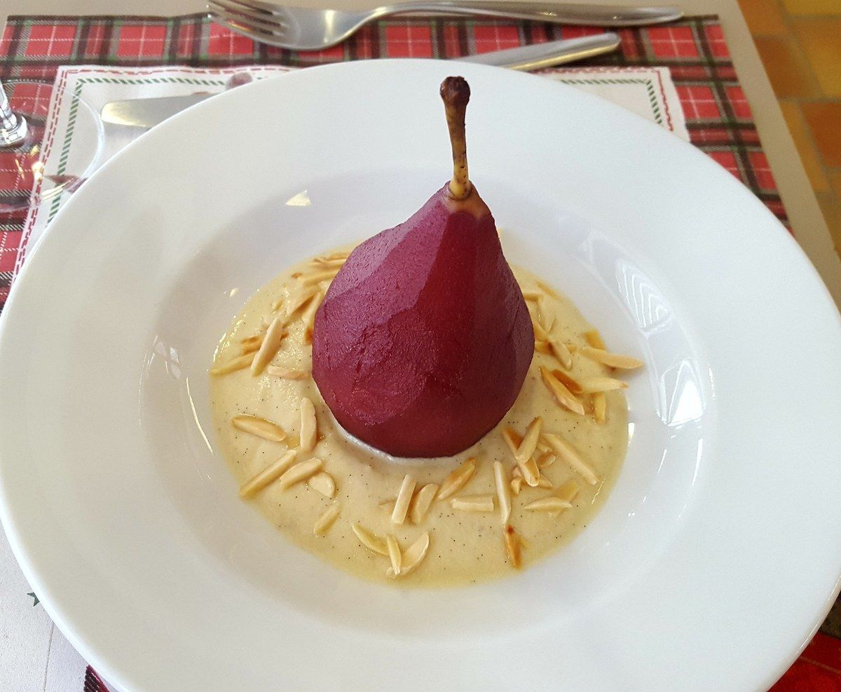 4) Mettre un fond de crème au lait d’amandes dans une assiette creuse, y déposer une poire puis parsemer d’amandes allumettes.