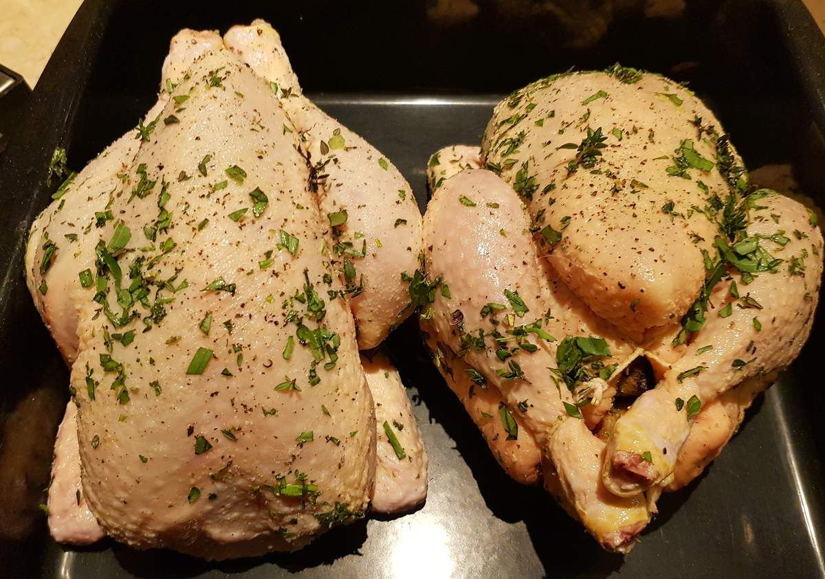3) Laisser les ficelles qui tiennent les cuisses des poulets. Ainsi la farce restera bien à l'intérieur. Saler et poivrer l'intérieur des poulets. Farcir les poulets avec la farce du point 2 en tassant bien. Dans un petit bol, mettre un peu d'huile ou de beurre à rôtir (3 càs). Ajouter un peu de sel et de poivre ainsi que la deuxième moitié réservée de l'estragon et du thym hachés. Mélanger. Masser l'extérieur des poulets de toutes parts avec ce mélange. Placer les poulets dans une lèchefrite et enfourner au milieu du four préchauffé pendant environ 1h10. A mi-cuisson, arroser les poulets avec deux petites louches de sauce (point 4). Pour vérifier la cuisson, planter la lame d'un petit couteau entre la cuisse et l'articulation. Le jus qui s'écoule doit être clair.
